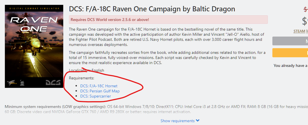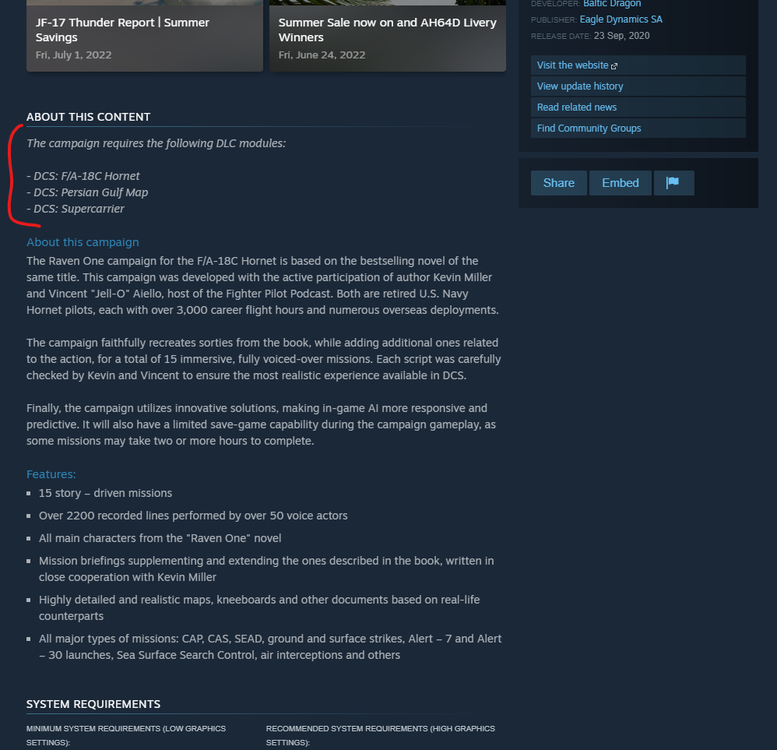 Open the DLC page and look for the "ABOUT THIS CONTENT" section. The list is usually at the very top... ...but if you can't find it, carefully read the whole section: Alternatively, if you want to be 100% sure, find the campaign in question in the ED store. The requirements there are listed very prominently, impossible to miss: -