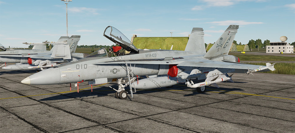 Models in DCS have dozens of animations. For example, "canopy open" is animation X playing from keyframe 0.0 to 1.0. Animations are controlled with arguments that can be put into a livery. And when this livery is loaded, those arguments tell the game: "animate me opened canopy", "animate me extended speedbrake", "animate me ripped off wings", and so on and so forth. If you look inside the folders in my archive, you'll see files named "description.lua". Open any of them in a text editor, and at the very end you'll find these arguments. The way it works is that first you pick a "VFA-103 ... Preflight" livery (in the Mission Editor or when spawned in-game, it doesn't matter). The arguments in this livery will give you extended ladder, installed covers, etc. You then play your preflight or whatever, and when ready to start the engines, you request rearming and pick a "VFA-103 ... Ready" livery. The arguments in this livery will retract the ladder, remove covers etc. You can swap these liveries back and forth however you like.