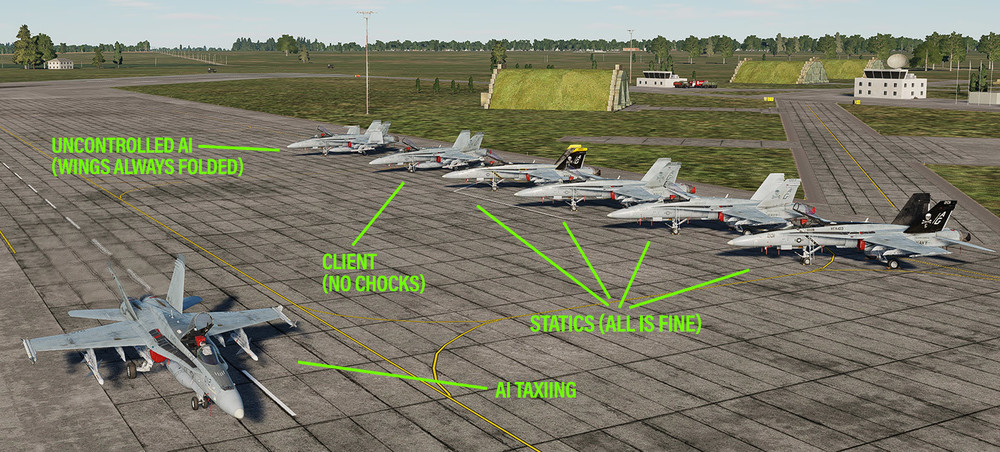 Hi, try these: https://drive.google.com/file/d/1ZmdPgNz-6dBBcRfaV6oP0C4JOYKawoez/view?usp=sharing Works fine with player aircraft (no chocks tho), uncontrolled AI (wings always folded), and static planes (no issues). Doesn't work with regular AI, as they cannot change their liveries and will fly with covers installed and canopy opened.