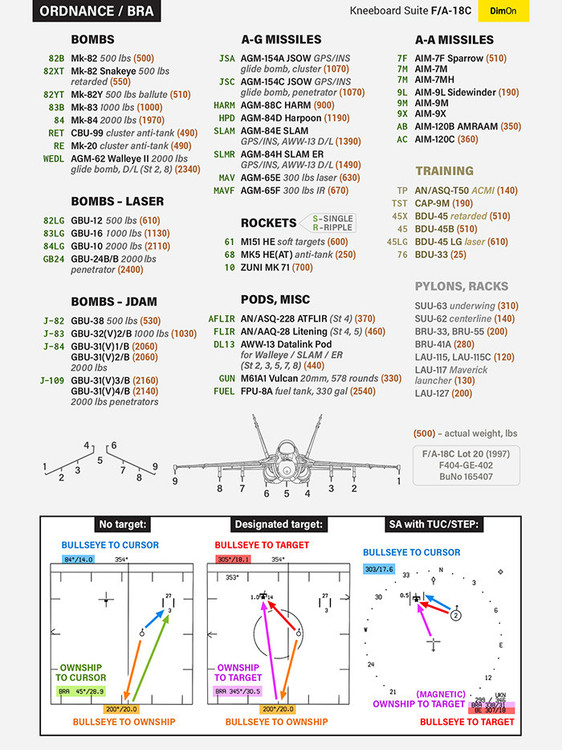 F/A-18C Kneeboard Suite - Updated 23 October 2025Minsky replied to Minsky's topic in Utility/Program Mods for DCS World 11 February 2022 - Ordnance page reworked: ordnance weight added, HAFU helper replaced with BRA helper. > Download here