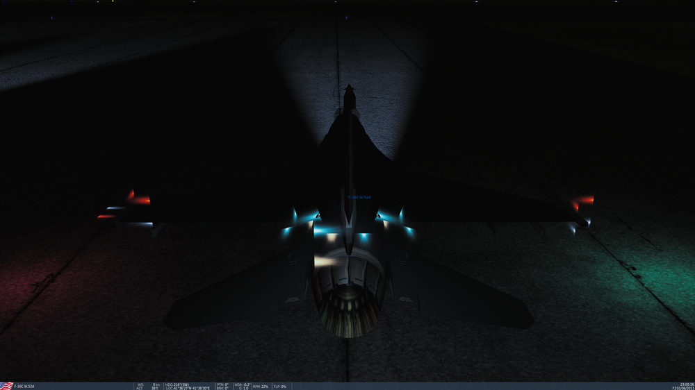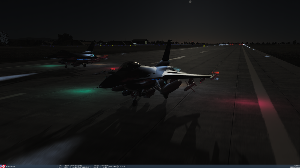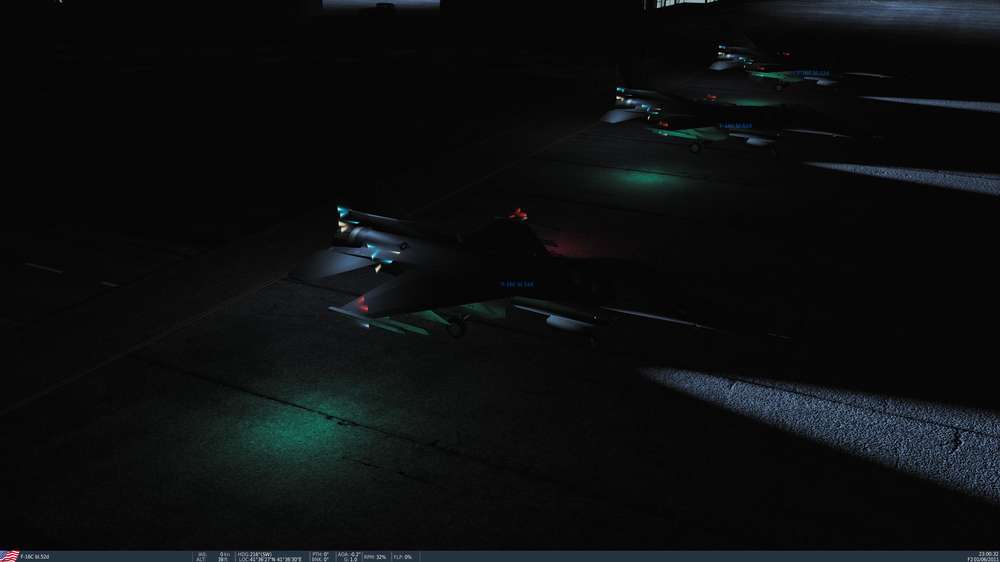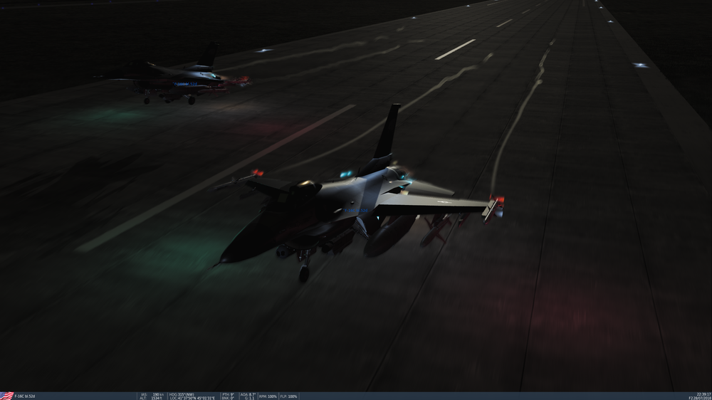 test with ME Hi Big nEwy...I have made the test with the mission editor....take off at night from batumi...The results are complete...With the f16 cm block 50 the light are correct...all ok...perfect...when i select Ai aircraft f16 block 50 and 52 the airplane start to take off and turn on the night lights but these are bugged....So we can say that night lights for these two AI aircraft are bugged....You can try by yourself simply...Create a mission with the f16 block 50 or 52 (not CM...this is correct)...mission start at 23:00 from runway...The aircraft takeoff and suddenly turn on the lights when accelerate on the runway....But these are completely bugged...So in the night free flight mission of the Viper....After 20 minutes 2 f16 block 52 take off with night lights bugged... Thank you for your attention... -