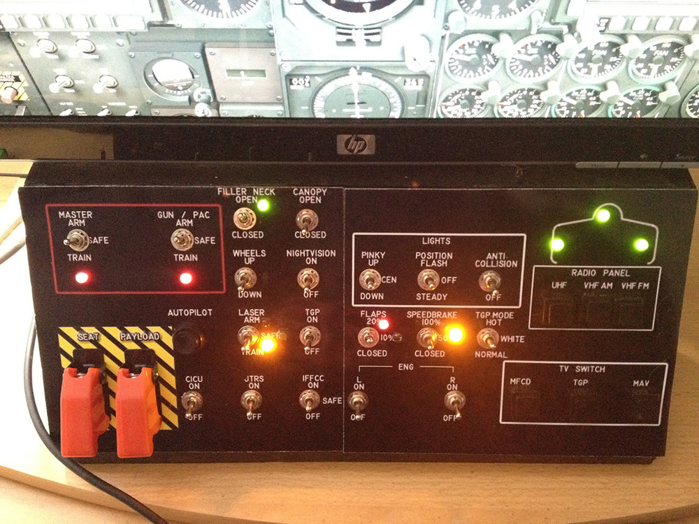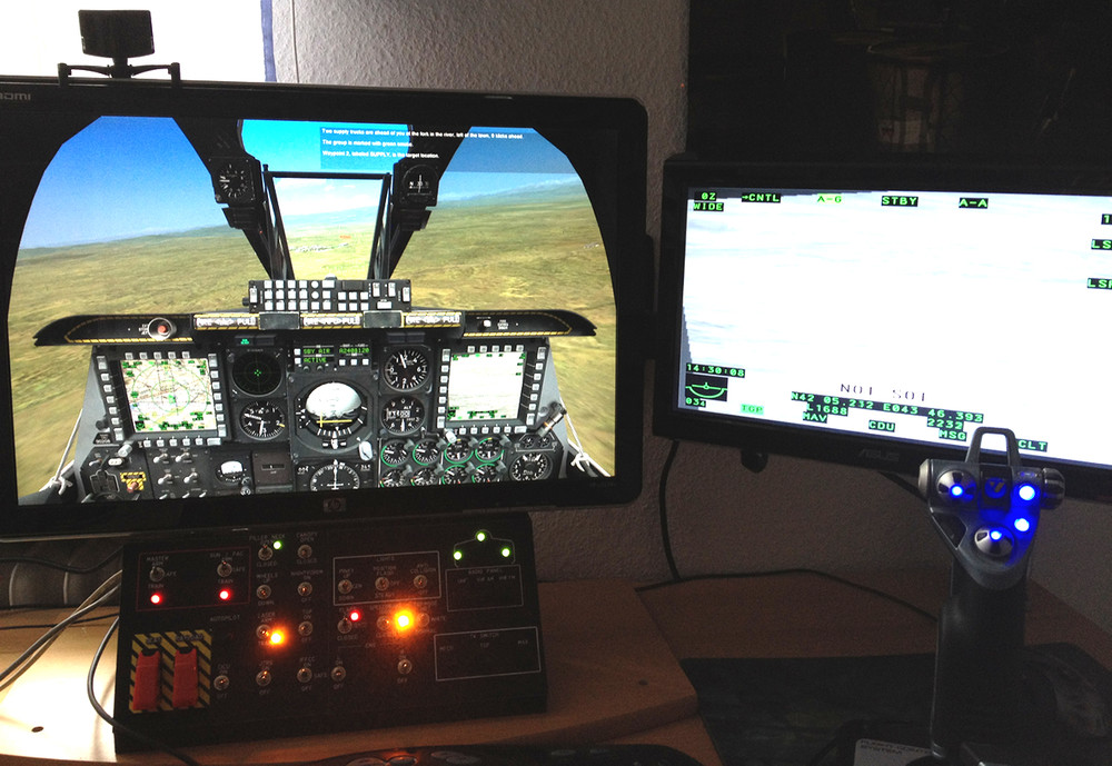 So, It's finally done! Thats how my "cockpit" looks like. (The Throttle is not included in the picture). My panel fits really really nice under the monitor and has no opportunity to move under or beside the monitor ;). All LEDS working well by toggling switches and I finally made it to bind all switches and Its working correctly with the game. I know I'm not that hardcore builder like other one's here in the forum, but I think for a medium player Its nice :D