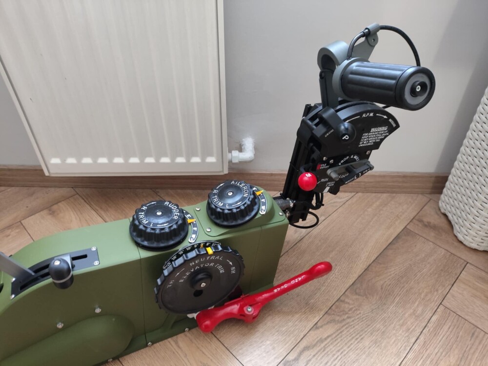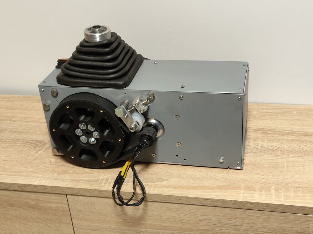 Hi, I wanted to share my version of FFB stick and rudder build. Here are more photos: https://drive.google.com/drive/folders/12bpjwd_FC87fGMXIHv5ax6Qkvx2cuK4a And description: 1. Electronics. Everything is based on Gigawipf's OpenFFBoard. He shared the electronic hardware and firmware but left the mechanical design to the builder's imagination. I just uploaded his PCB gerber file from Github to JLCPCB and ordered it with SMT assembly (important note: when you order electronic parts from JLCPCB for your boards they don't send them to you. They are only used for assembly and are just reserved for you in stock untill you order SMT assembly.) https://github.com/Ultrawipf/OpenFFBoard Everything worked properly first time. OpenFFBoard connects with PC via USB and sends control signals to Makerbase ODrive 3.6 dual motor controller via CAN. OpenFFBoard can use also different motor controllers like VESC or a Gigawipf's own board. I decided to use MakerBase ODrive clone because it's cheap and somewhat reliable. 2. Motors. 6,5" cheap hoverboard motors rated for 250W at 36V. I power them with 48V, and set current limit to 13A which gives around 600W per motor. They are not even warm. And for rudder motor it's 16A. 3. Encoders. I use CUI AMT103 incremental encoders + endstops for homing. With ODrive you can program startup homing procedure, when after finding encoder indexes the axis move towards one endstop limit switch, and then move back set amount of turns. Effectively making stick always center itself at startup. When using incremental encoders the motor controller always needs to find index at startup. And with this kind of design where rotation is limited to narrow angle it has some serious drawbacks: ODrive can move to search index (that is one specific point of full 360° rotation of encoder) just in one set direction. If the axis meets mechanical endstop and cannot move more it still tries to rotate until it finds it and cannot change direction on its own. I don't need to tell what happens next if you don't turn it off. So I set that indexes mechanically somewhere before endstop, and then put on the drive belts. This way I'm making shure it "always" finds the index. But that makes another drawback - I need to put the stick in specific region/area before indexes. (for example fwd-left quadrant) If I put it somewhere else, where gears are close to specific endstop but AFTER indexes it will never find them and try to snap the belts. I will probably change to absolute magnetic encoders that don't need to search for index signal. For the rudder pedals i bought even cheaper Makerbase-MINI with integrated absolute encoder (AS5047P) and it don't need to calibrate each startup, but it still doesn't remember the center position after power loss, so a homing procedure with endstop is needed. Another weird thing with ODrive: endstops are active all the time, and not only when homing. If I move the stick to the limit of any axis it recognizes limit switch and turns itself off. You can tell that touching a limit in a stick is nothing bad, but ODrive is just programmed that way and there no workarounds inside software configuration. But I found a workaround. Very stupid but it works . I connected both limit switches GND pin to programmable timer relay switch. It disconnects them roughly after time the startup procedure is done, and reconnects after power restart - so after next startup when homing needs endstops it can have them for a while. 4. Mechanical design. For the stick mechanics I decided to make something like lazerwing FFB project with 2 actuators parallel to each other. This design idea is probably taken from FWD cars gear change lever where 2 parallel cables move perpendicular axes. I used 10mm ball end rods from aliexpress for linkages. Bearings are 72x50x12mm. Left motor moves Y axis, right motor moves X axis. There is some drawback im this design, because at high deflection the stick moves a bit in X axis when moved only in Y (hard to describe it). But it's very little in my case, totally not noticable. For rudder pedals mechanics it's simple, just 2 parallel axis on bearings. I don't have access to CNC machines but I have manual mill and lathe so I made everything what I can with 2,3,4,5,6mm aluminium sheet metal, and for other parts, like bearing housings or belt pulleys I use 3D printing. Motors drive the 25mm wide HTD 3M belts, gear ratio is around 1:6,5. Motor gears are 23mm diameter and are made of steel, bought from CNC shop. Big axis pulleys are 147mm diameter and are 3D printed with PLA, with high 50% infill and 8 perimeter outer walls. I think it's enough for this torque. For connecting stick with base I made part similar to Virpil or thrustmaster but thicker. I just put it in each other and secure with large nut. There's round electronic connector inside for buttons. OpenFFBoard works with shift registers up to 64 or 128 buttons if i remember, so in the stick there is another Gigawipf's board with few shift registers and SPI protocol (5-pin). Also belts and pulleys will be hidden below 3D printed covers, that are not ready yet. And the rubber boot is from some old car gear lever cover. I think that's all. -