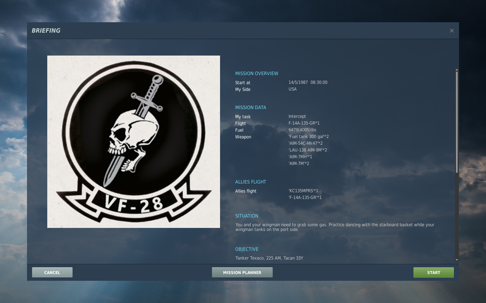 I liked the fictional squadrons so much I edited a bunch of the missions to let me fly as Bozo and Jester spent an entertaining amount of time in Gimp making another VF-28 skin so I could have someone to fly with. Gave me a bit of freedom to not worry too much about whether I was doing things right or not. I like to imagine the continuing adventures of VF-28 and the USS San Clemente.