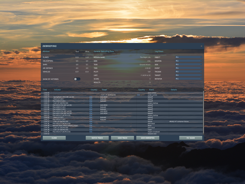 The track file is 23mb after 4 minutes in the mission. Since the max size of a track file upload is 5mb, I simply can't upload it to confirm the issue. Attached is a screenshot of the mission debrief where you may notice, at 2:04:37, the "AN/ALE-47 container failure" just prior to Colt 1's(player) death. No mods and fresh repair. If you can tell me a way to send an oversized track file, I will gladly upload one.