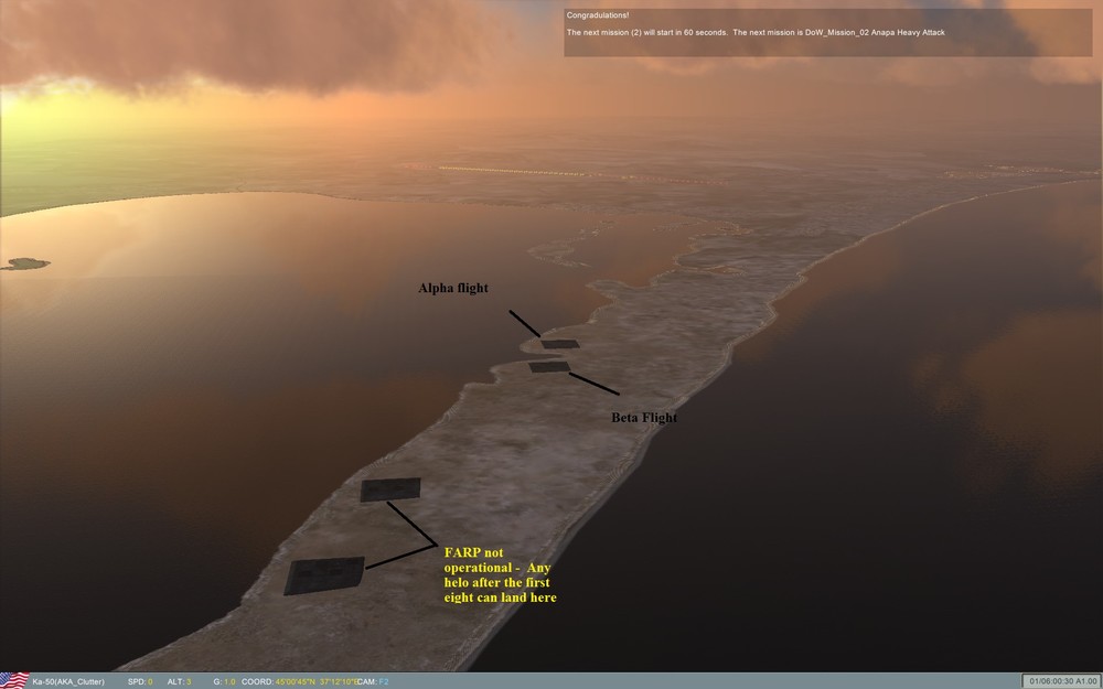Distiler, Thanks for trying the campaign, and posting this question/observation. This one is a little picky as we found out in testing. you have to land at the correct FARP as shown by the way-point in ABRIS for the triggers to get 'Credit". There are four FARPS on the finger of land. The two nearest the carrier are NOT active. The two closet are active and have units at the FARPS. Alpha flight MUST land at the one closet to Anapa airfield, while Beta must land at the second closet to Anapa . I have tried to attache a screen shot from this mission showing where the helos should land. The way this mission works is not through normal triggers, but through the scoring system. It is set up to count the number of players that enter the game( In Alpha and Beta flights) up to eight. After that, each chopper that lands at the specified FARP then scores points (4 I think). Once all helicopters are recognized as having landed, the Score Greater than x is tripped and then the messages as to the campaign starts. May not have been the best way to do it but it works. Also, in building the missions logic templates were used to help cut down on the number of lines that had to be entered in each mission. IN this one the ONCE triggers for Mission_Failure_16, Mission_Stalemate_17, and Mission_Success_18 have blank rules. That is OK as they are not used in this mission. I would also mention that if you fly this in the single player mode, the next mission will not launch automatically, but you should get all the mission message. Please try again as described above, and let me know the results. :pilotfly: Thanks for trying the campaign.:thumbup: -