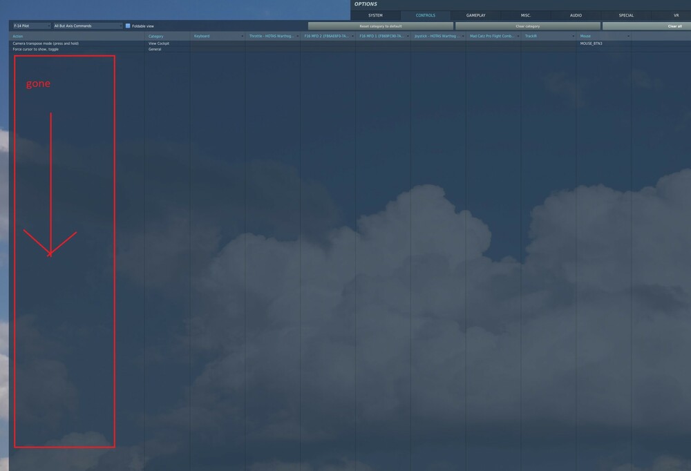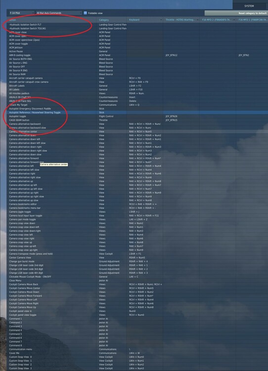 Hi After, the update the F14 Pilot and Rio are missing the keyboard controls, if you see the screenshot all controls are gone. I can't control anything. I have my binding profiles backup, but these cant be imported because the keyboad stuff is missing. Any ideas how to get it back. The default.lua file is here C:\Program Files\Eagle Dynamics\DCS World OpenBeta\Mods\aircraft\F14\Input\F-14B-Pilot\keyboard\ and doesn't appear corrupted. Thanks