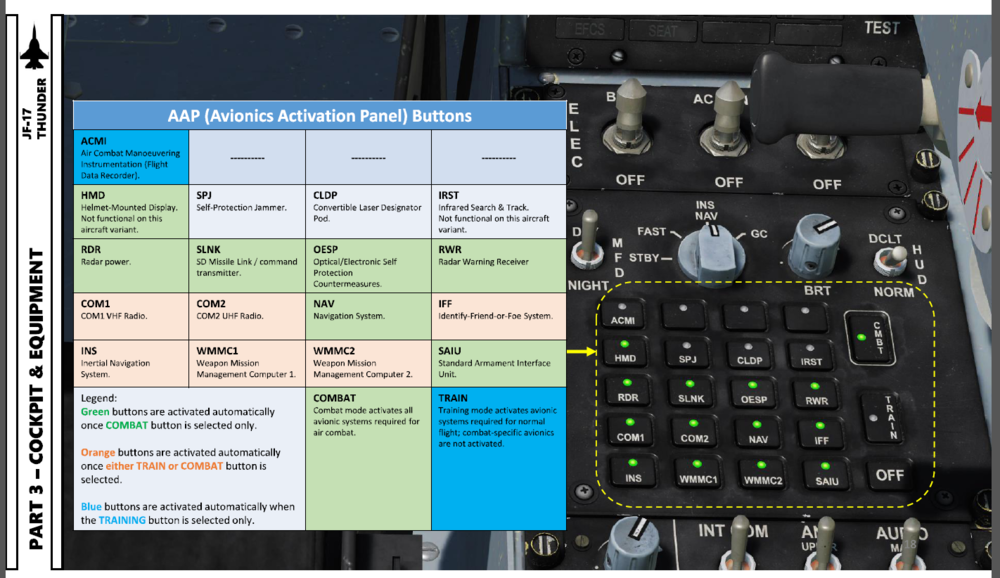 This was a cold start, when you click the CMBT button on the AAP panel all systems necessary for combat are activated with the exception of the SPJ pod which must be pressed individually. Here is a snip of the page in the Chuck's Guide for the Jeff that shows the AAP panel, please advise which button is the one for the WMD7, to my knowledge there is not one and it is not listed in the legend.