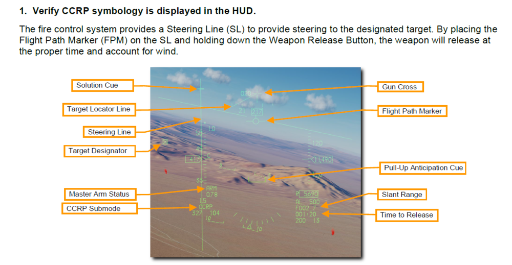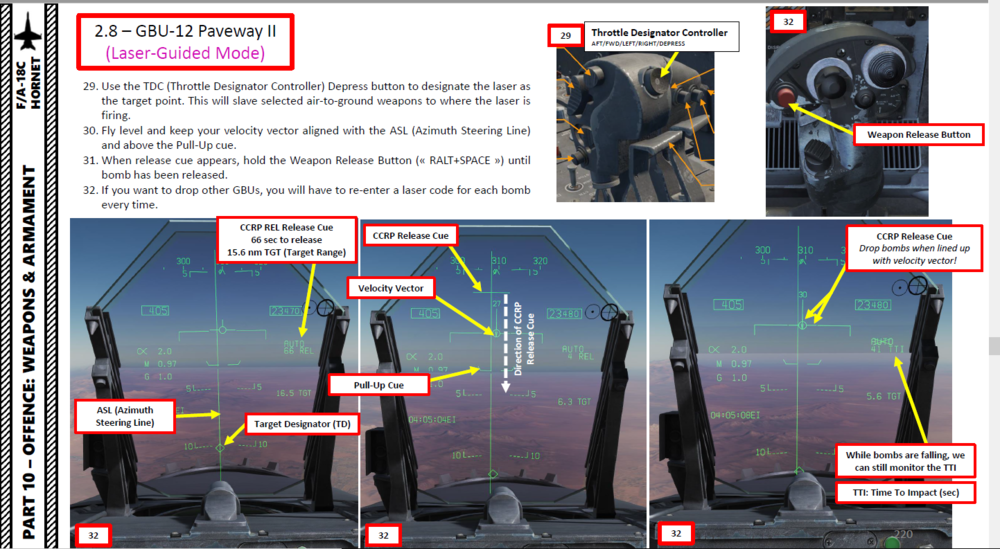 One trick I just learned was if you add a steerpoint in Mission editor that you want to use in TOO mode, make sure to put the steerpoint altitude at 0 feet so it will then give you a true MSL altitude that transfers to the JDAM or JSOW. If you leave it at the aircraft altitude like where you want to be when you spawn in at WP 0, the rest of the points will pick up that altitude as well if you don't manually change it and then your JDAM will think the TGT is somewhere up in the sky. And to re-emphasize: in an AUTO release, as soon as you see the weapon release line start moving down the ASL from the top - press and HOLD the weapon release button until the weapon is released from the jet. And a good technique is to keep holding it for a couple more seconds just to be sure. Especially if release multiple bombs on the same pass. See attached screenshot from Chuck's guide