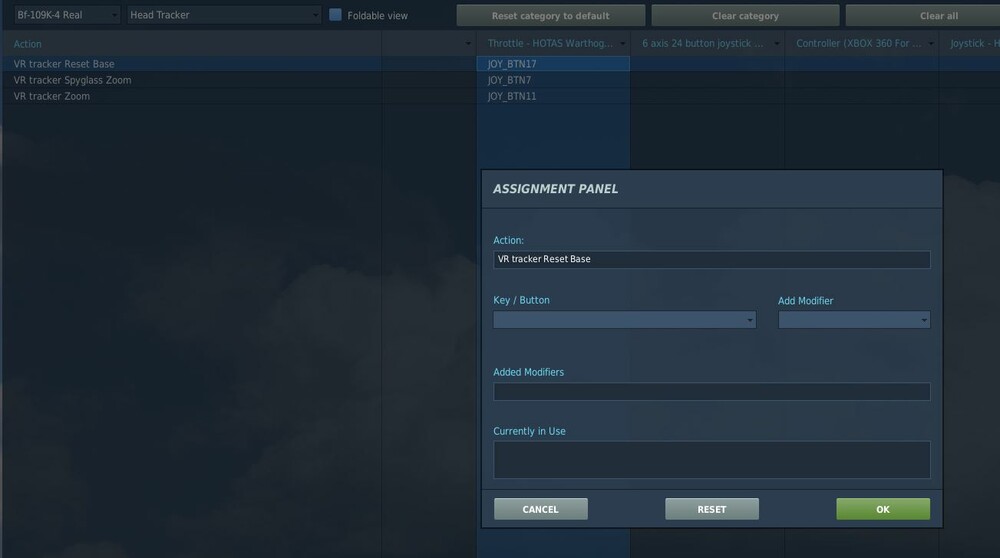 I have a vr head set and can map some buttons to my throttle in the BF109 as per image 1 ( JOY~BTN17 etc). But when i try this in the DORA ( click on the tab in image 2) the assignment panel does not open and per image 3. Has anyone else had this problem or do you know a work around. I have tried start from scratch by clearing the category but this still does not work