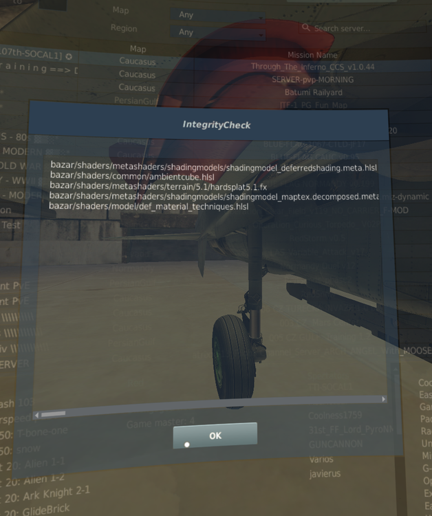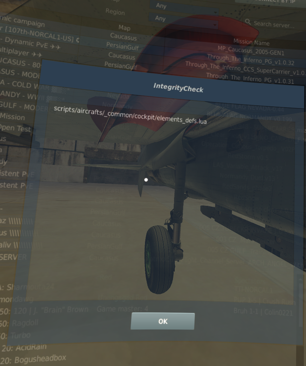 The last few days I keep having issues with failed integrity checks. After deleting the fxo, metashader2 and mission editor files I can log in. But once in the server I get “timed out” and a new list of random files that “Failed Integrity”. The files that fail are never the same and I have an unmodded Steam DCS running the newest Open Beta. So how am I failing the integrity checks if DCS is unmodded and why are the files that “failed” completely random. I did a clean install to see if that would help but after that I still had the same issues. Please help
