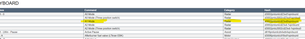Hi everyone! I have installed DCS from scratch due to new OS (win 11). I have saved all joystick and keyboard bindings from the previous one. Important note: no hardware changes in the meantime. So I reloaded the joystick profiles - no problem. Then I passed to the various keyboard.diff.lua, but nothing was loaded, everything was always in the default configuration. Then I found, when exporting the keyboard assignments in HTML format, that the hash values associated with the individual commands have changed. Example (Viggen plane) - extract from the keyboard.diff.lua saved by me (from the previous DCS installation): ["d3003pnilunilcd23vd1vpnilvunil"] = { ["added"] = { [1] = { ["key"] = "1", ["reformers"] = { [1] = "LShift", }, }, }, ["name"] = "A1 Mode", }, thus the "old" hash for "A1 Mode" command was: d3003pnilunilcd23vd1vpnilvunil now in the new DCS installation the same command results like this the hash value is a new one: d3002pnilunilcd23vd0vpnilvunil Therefore to have the assignment read correctly by the new DCS, I had to replace the old hash with the new one for "A1 mode" command, inside my keyboard.diff.lua backup file. Same thing for many of the commands in the keyboard.diff.lua files saved by me from the previous installation. Is there a less complex way to retrieve keyboard assignments? I have done a lot of customizations and having to do this hash remapping work is impossible... as well as thinking about reassigning all the commands from scratch... Thanks in advance to anyone who can help me!