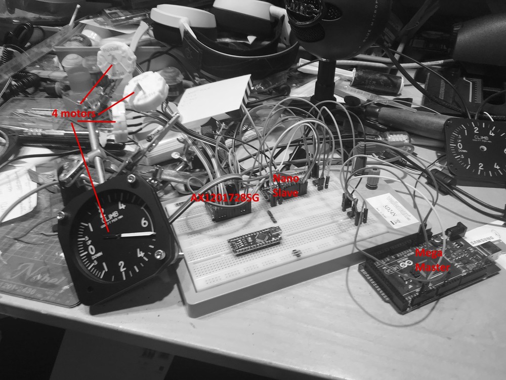 Today I've been playing with more motors to test if the Nano can drive 4 of them, which is what the AX1201728SG chip is supporting. This was no problem at all so I think that i will try to use one nano per 4 dials, at least for the engine cluster. I've also tested to run it on a RS485 network which also proved to be easy so that is what I will use. On my test bench I have one Mega acting as the master, one nano acting as a slave, driving 4 motors using the AX1201728SG chip. Works like a charm. I might need to clean my table :music_whistling: