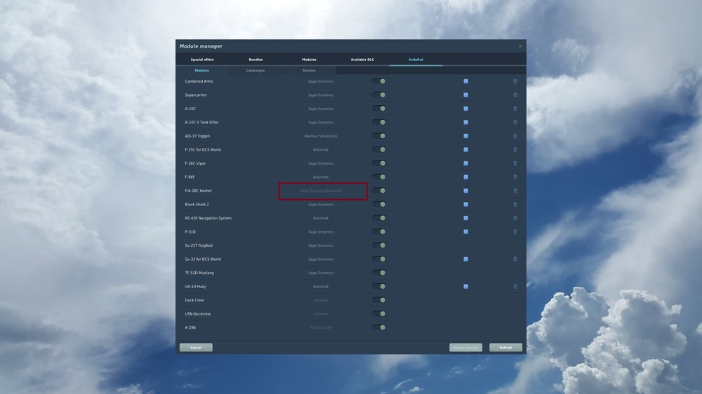 Today I thought my profile for f 18c was not working. Try auto start f 18, that would not work, my bbi 64 buttons and switches would not work. After several hours of frustration I decided to try another a/c, every thing works, tried all other a/c and heli's, all work. Decided to check mod mgr to discover the the f 18c is grayed out, but will show up in mission's and the mouse will control button's and switches. Look in the module list and the f 18c is not even listed. What is going here. Decided to uninstall and reinstall OB hoping that would clear things up, but no go. Need some help here