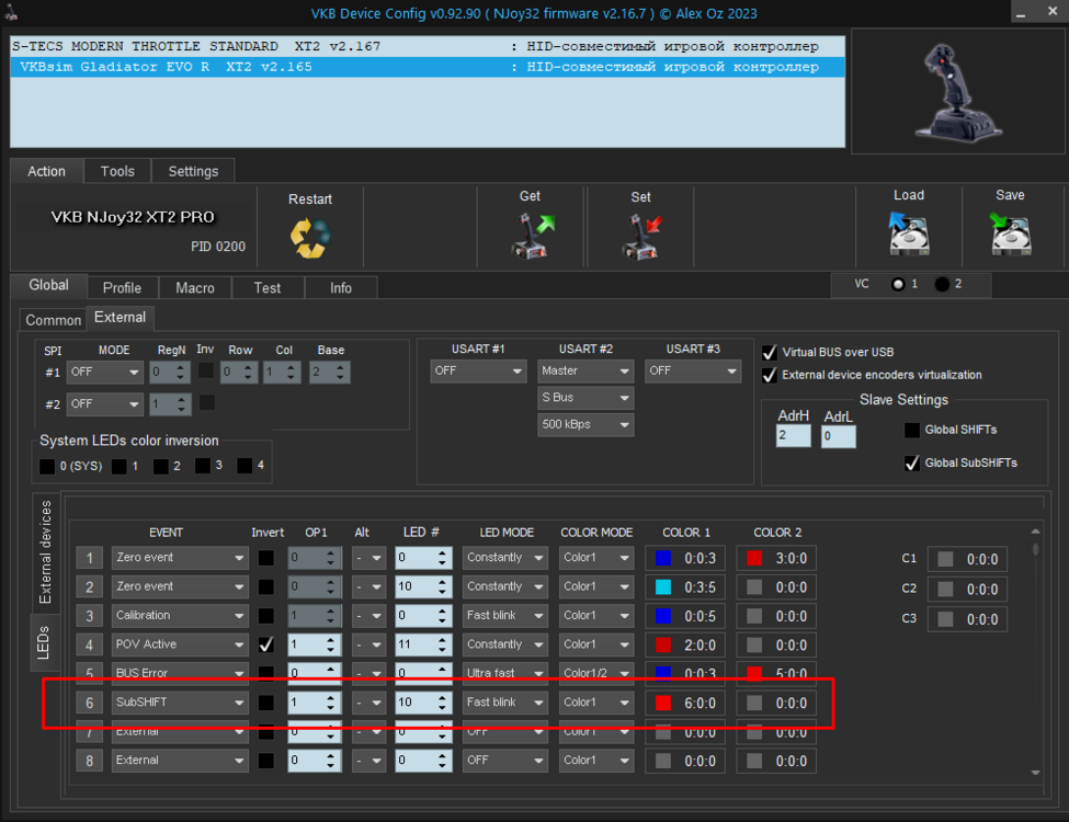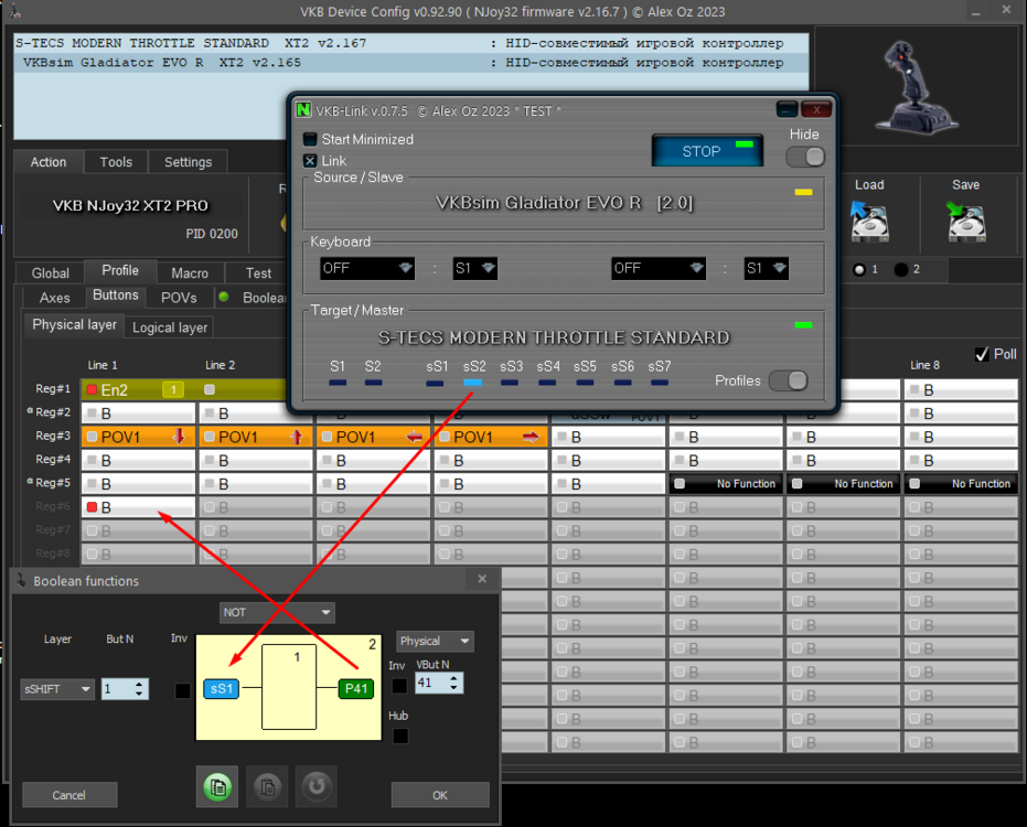Теперь обратная передача. Мастер может передать слейвам только состояние шифтов/сабшифтов и слейв их сможет заюзать только при указании глобальности Для примера я сделал кнопку с фиксацией на левой ручке (красную) конверсия её состояния в сабшифт: Здесь обнаружился баг - сдвиг индексов сабшифтов - поэтому пока ставим со сдвигом ( SubSHIFT #2) [ пофиксено v2_16_8] Но на слейве он проявится как #1: также его можно использовать как операнд для булевых (конвертировать в кнопки) : Патч индексов будет позже - уже не успеваю. Done. fw v2_16_8 Также буду отсутствовать какое-то время . PS/ описанная конфигурация проверена на работоспособность