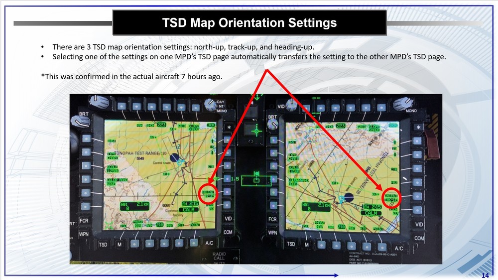 •There are 3 TSD map orientation settings: north-up, track-up, and heading-up. •Selecting one of the settings on one MPD’s TSD page automatically transfers the setting to the other MPD’s TSD page in a given crew station. *This was confirmed in the actual aircraft 7 hours ago.
