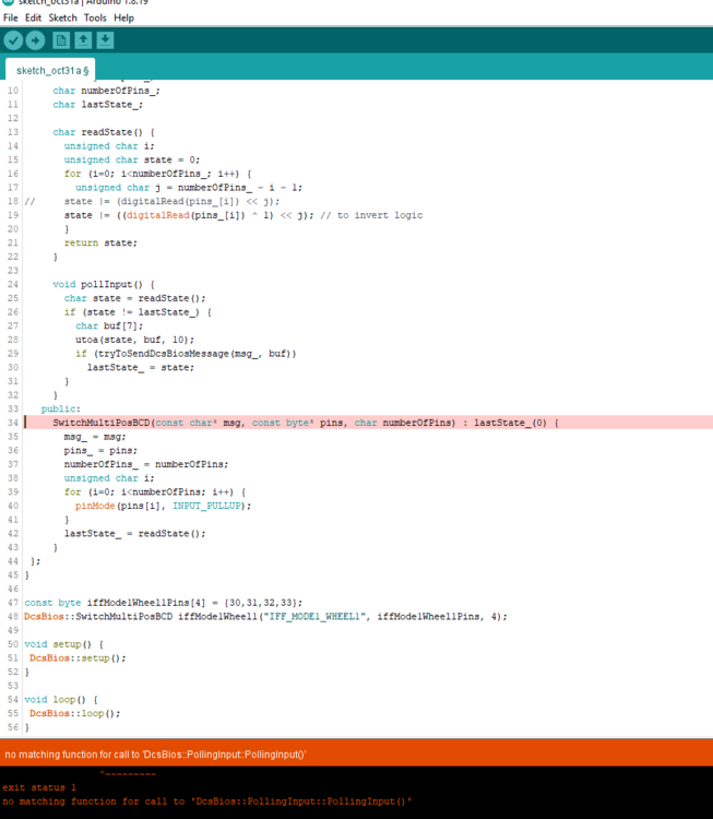 23. The code you posted is failing with my pins exit status 1 no matching function for call to 'DcsBios::PollingInput::PollingInput()' #define DCSBIOS_IRQ_SERIAL #include "DcsBios.h" namespace DcsBios { class SwitchMultiPosBCD : PollingInput { private: const char* msg_; const byte* pins_; char numberOfPins_; char lastState_; char readState() { unsigned char i; unsigned char state = 0; for (i=0; i<numberOfPins_; i++) { unsigned char j = numberOfPins_ - i - 1; // state |= (digitalRead(pins_[i]) << j); state |= ((digitalRead(pins_[i]) ^ 1) << j); // to invert logic } return state; } void pollInput() { char state = readState(); if (state != lastState_) { char buf[7]; utoa(state, buf, 10); if (tryToSendDcsBiosMessage(msg_, buf)) lastState_ = state; } } public: SwitchMultiPosBCD(const char* msg, const byte* pins, char numberOfPins) : lastState_(0) { msg_ = msg; pins_ = pins; numberOfPins_ = numberOfPins; unsigned char i; for (i=0; i<numberOfPins; i++) { pinMode(pins[i], INPUT_PULLUP); } lastState_ = readState(); } }; } const byte iffMode1Wheel1Pins[4] = {30, 31, 32 33}; DcsBios::SwitchMultiPosBCD iffMode1Wheel1("IFF_MODE1_WHEEL1", iffMode1Wheel1Pins, 4); void setup() { DcsBios::setup(); } void loop() { DcsBios::loop(); }