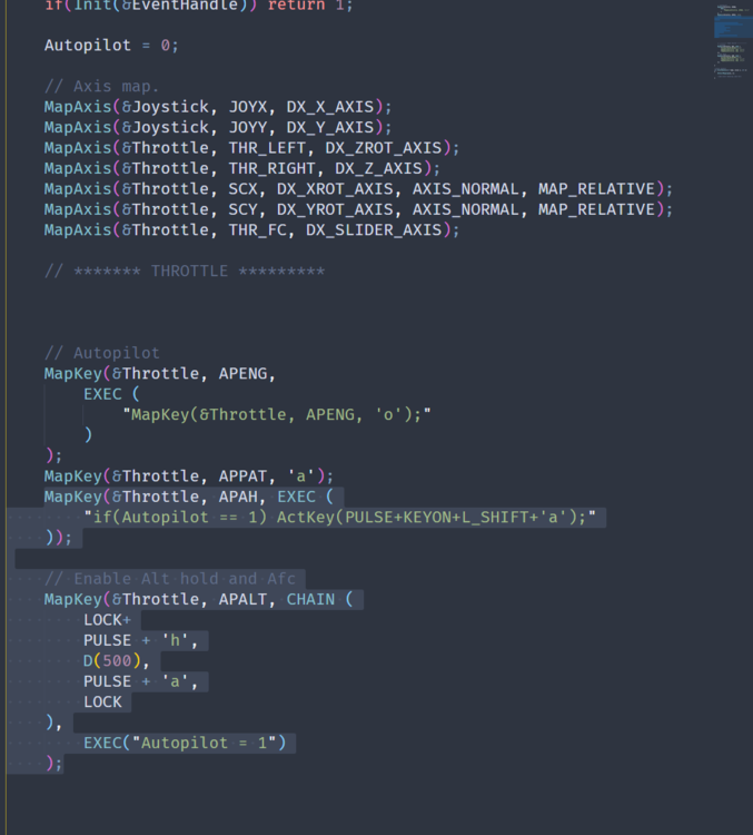 Hi all. Bought the Warthog Throttle. And I am having a go at scripting, its pretty fun. Just reading the manual atm. My plan is to make a working script for the Harrier. good times :) One question about the MapAxis optional parameters. with the slew axis I wrote this : MapAxis(&Throttle, SCX, DX_XROT_AXIS, MAP_RELATIVE); MapAxis(&Throttle, SCY, DX_YROT_AXIS, MAP_RELATIVE); But when I test it in the device analyzer, they return to the center. I thought they were supposed to stay at the maximum or minimum value reached until you change your movement direction. That is what the manual says anyway, what am I doing wrong? Solved it, it should be this: MapAxis(&Throttle, SCX, DX_XROT_AXIS, AXIS_NORMAL, MAP_RELATIVE); MapAxis(&Throttle, SCY, DX_YROT_AXIS, AXIS_NORMAL, MAP_RELATIVE); I was missing one parameter