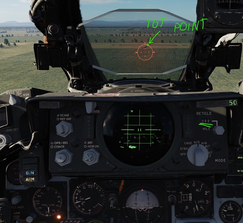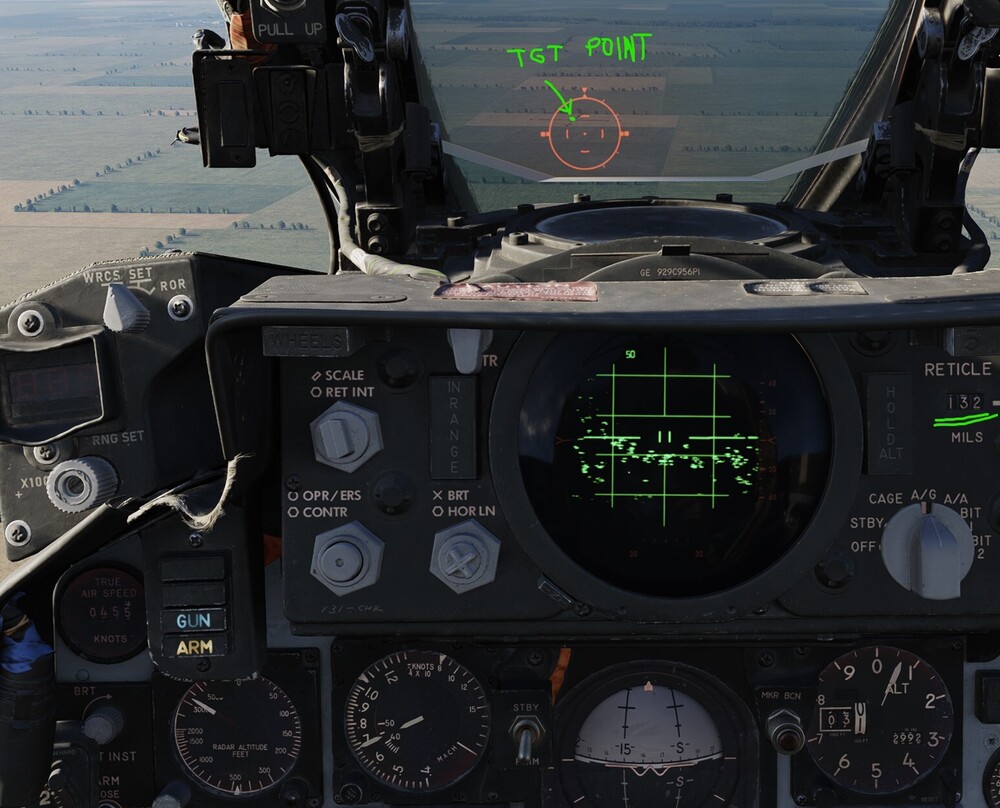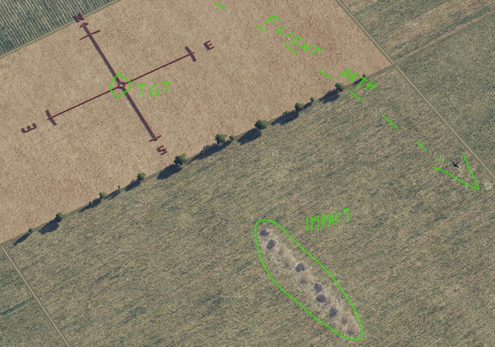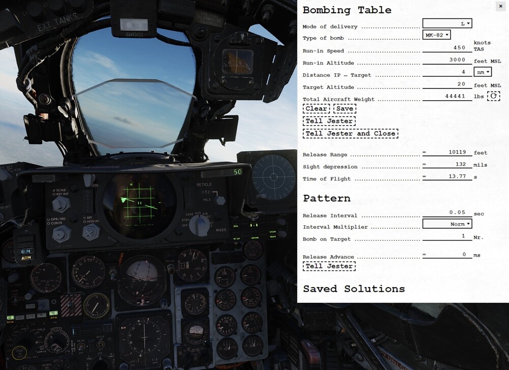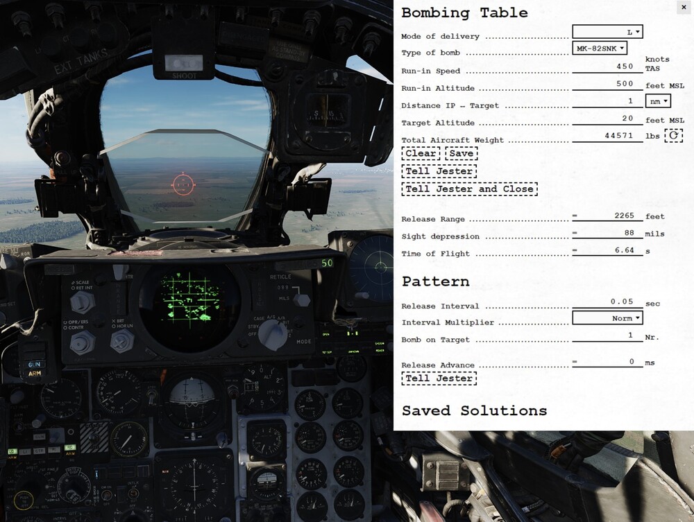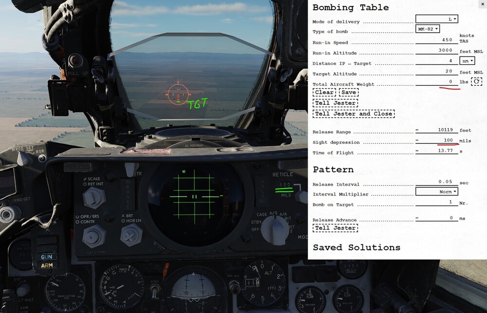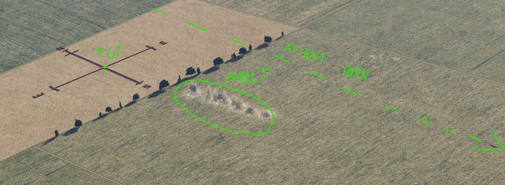 Just tried setting zero aircraft weight in bombing table, resulting sight depression makes it so the bombs fall way short of target. Screenshot shows reticle position while overflying IP. So, with zero weight depression is too low. I tried setting the correct depression manually while sitting in an active pause over the IP (by adjusting sight depression until the reticle is over the target), for this case (Mk 82, 450 KTAS, 3000 Ft, 4 nm IP-TGT) the setting was 119-120 mils. Then I tried to enter total aircraft weight that will result in 119 mils calculated depression, it was around 27000-27900 lbs. Edit: 118 mils results in this: Slightly short (no release advance was set), but pretty close for this release mode. -