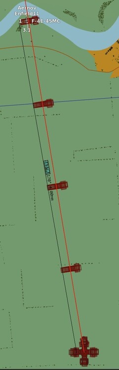If I recall correctly, in Laydown mode you can use properly depressed sight to determine the moment to start holding Pickle since the sight mark would be on target at the moment of IP overflight. But in my attempts to utilize this method, I encountered a seemingly consistent issue - sight depression, as calculated by in-game Bombing table, is too big, resulting in sight mark being off-target (marking position significantly closer to the plane), so if the mark-on-target method is used to initiate release (instead of normal IP overflight), bombs will fall long (as far behind the target as the mark was before it at the IP). I tried Mk82 LD, Snakeeyes in HD mode, M117 and Mk84 LD, altitudes from 500 ft to 10000 ft, all at 450 KTAS, and the results were the same: depressed sight mark was lower than it should have been to be over the target at the moment of IP overflight. Attached are two tracks with Mk82 slick (3000 ft, 4nm IP-TGT) and Snakeeyes (500 ft, 1 nm IP-TGT). Also, some screenshots with sight mark position relative to the target at the moment of IP overflight. 1) F-4E L Mk82.trk Bombing table setup for this track: Sight mark at IP: Result after aiming with sight: 2) F-4E L Mk82 Snakeeye.trk Setup for the track: Sight at IP: Impact: If IP overflight is used to initiate release, bombs fall on target, so the error here is in the sight depression.