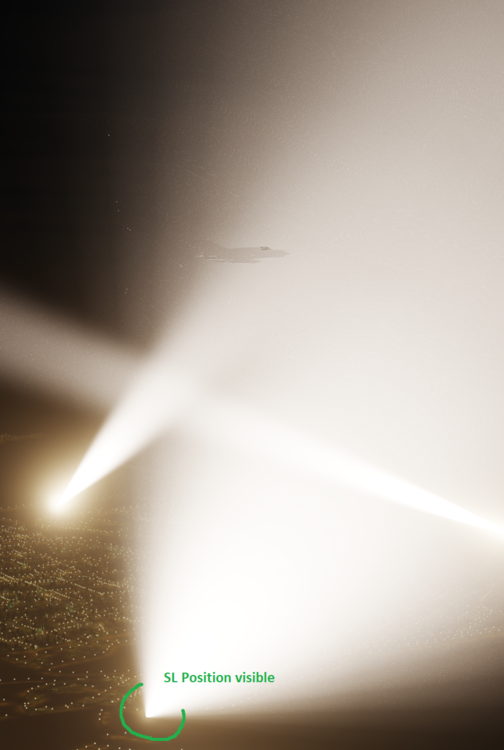 On the left - camera is outside of searchlight beam, on the right - inside the beam. The beam and "flare" around the projector itself disappears completely, while cockpit gets "washed out", not really flooded by bright light: -