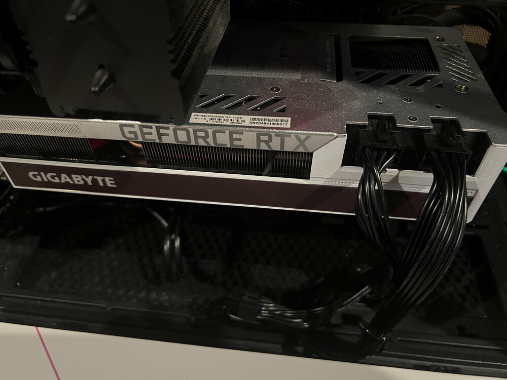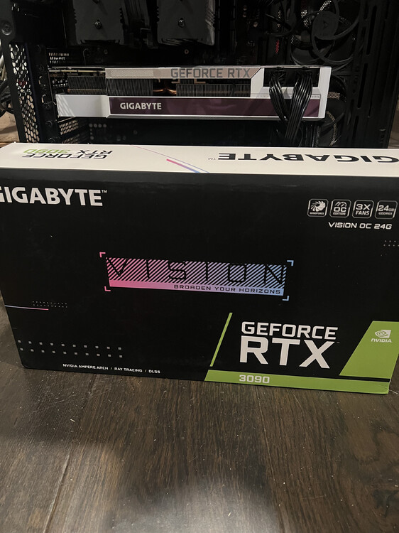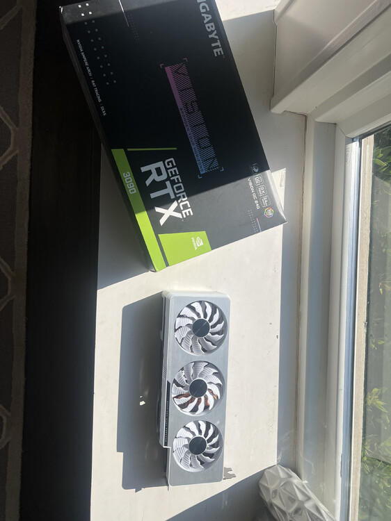 SOLD I have my Gigabyte Vision RTX 3090 24gb VRAM GPU for sale. It is in perfect working order and condition, freshly pulled from my racing simulator rig, replaced with a newer card. One owner, purchased new. Never mined, not overclocked. Always in a personal gaming PC. Original packaging included. It is the white/silver scheme. Also of note is this card takes two standard 8-pin PCIE power plugs (not the new 12-pin nvidia power plugs)—so even older power supplies work with this card. Runs iRacing, DCS, and other sims at triple 1440p without breaking a sweat. Asking $675 shipped to continental U. S.