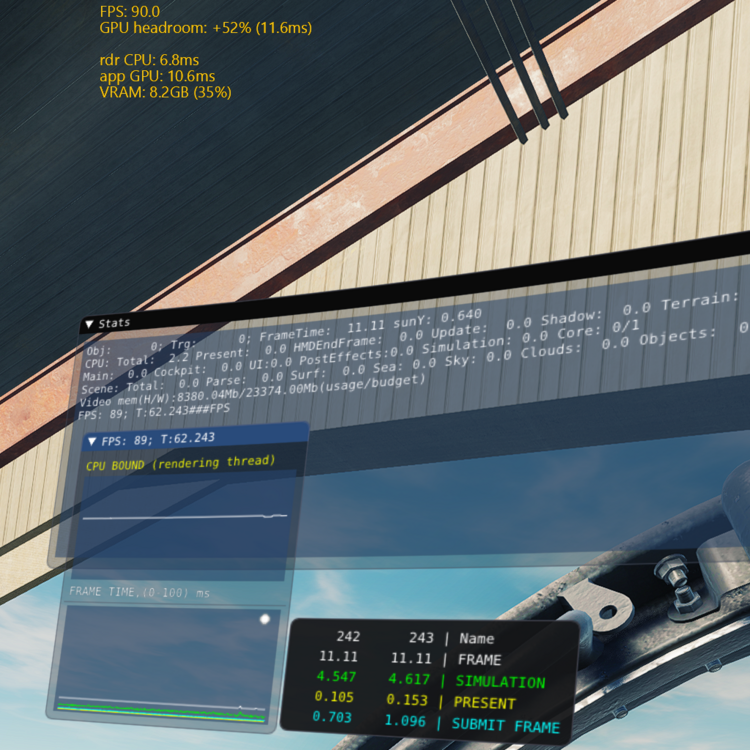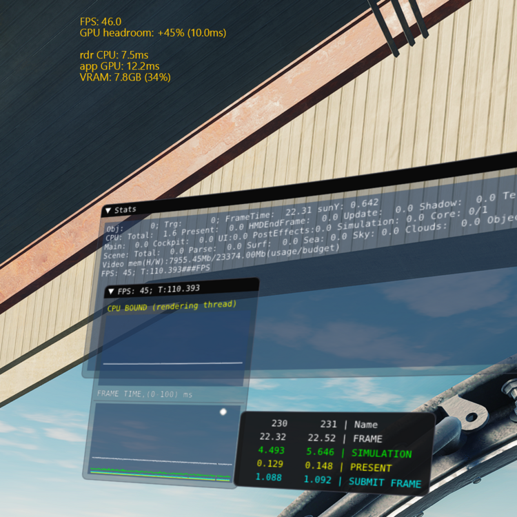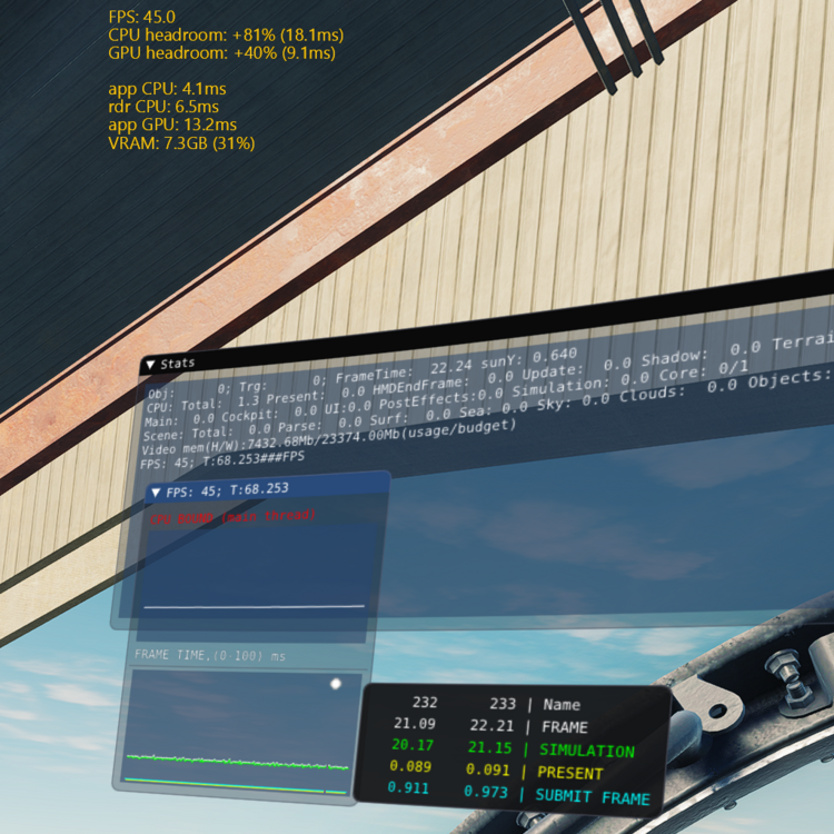 Hi there ! I always noticed that DCS didn't perform as good with WMR / OpenXR, as when I was using SteamVR and OpenVR. Lot of small and random stutters compared to the butter smooth experience with the latter. It appears that after setting SteamVR to handle the OpenXR API, things are smooth as silk again !!!! This afternoon I ran some tests so see what's wrong with WMR/OpenXR... The result is quite surprising. When using WMR / OpenXR with Motion Reprojection activated, simulation time is on par with frame time (around 22ms) : When using SteamVR / OpenXR (motion reprojection activated), simulation time drops to around 5ms !!!! WTF ? : The thing is, when disabling MR, the simulation time in WMR / OpenXR drops to 5ms as well ! : So it appears, correct me if I'm wrong, that WMR has very peculiar way to handle the reprojection, a way that literally is milliseconds hungry !!! Some might say this is a bug in DCS counter when motion reprojection is on (why only when WMR is in charge of the VR API then ?), but the fact is that in one case you have stutters all over the place (despite a FPS stuck at 45) and in the other case they're gone ! Did anyone else experience this ?