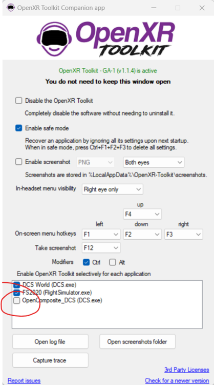 Ok, here's a possible fix - it's working for me. Hope you have some success with this too. Run OpenXR Toolkit Companion app, and deselect Open_Composite_DCS (DCS.exe). Run OpenXR Toolkit Companion app as usual. Run XRNeckSafer as usual. (I'm running the Beta 5a version of Necksafer). Cheers, Redwing