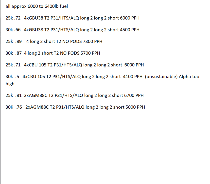 Did a couple of tests at 25 and 30k altitude....read left to right (altitude, mach, ag ordinance, t2 (2 wing tanks) p31 (tgp) hts ecm long pod, then a2a ordinance, longs are 120c short 9x, then fuel flow pounds per hour..... used burner to .88 or .9 ish mach then mil power...then fast fowarded (straight and level)