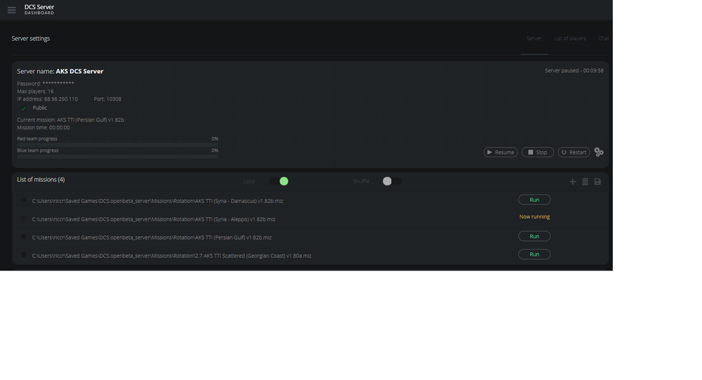 This was first reported back in May as shown in the link below with no answers or fixes so far. The WebGUI to control the dedicated server shows the wrong mission running. As shown in the image below, the top part of the screen shows the Persian Gulf mission running, while the bottom half shows the Syria-Aleppo mission running. Clicking on any button except the last one on the list runs the mission ABOVE the one selected, but the bottom half of the screen always shows the second mission on the list as being the running mission. As a result, there is no way to run the last mission on the list (since there is no mission below it). The same behavior happens when it comes to removing a mission from the list. If you select a mission and choose to delete it, the mission ABOVE the selected mission is deleted. Again, this means there is no way to delete the last mission on the list. Any ideas from the development team? This has been going on for a LONG while.