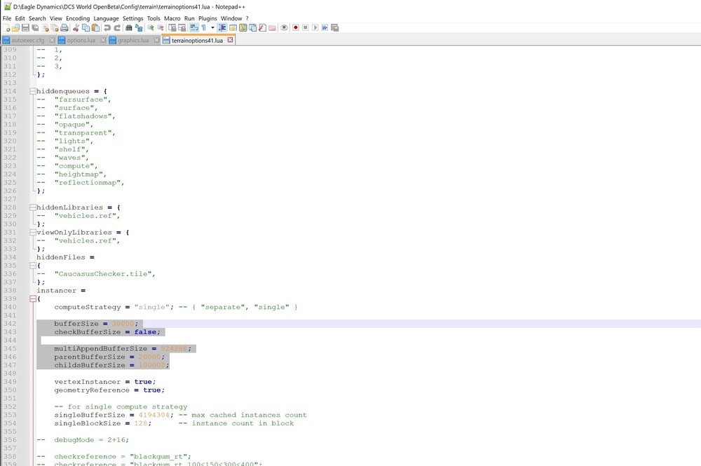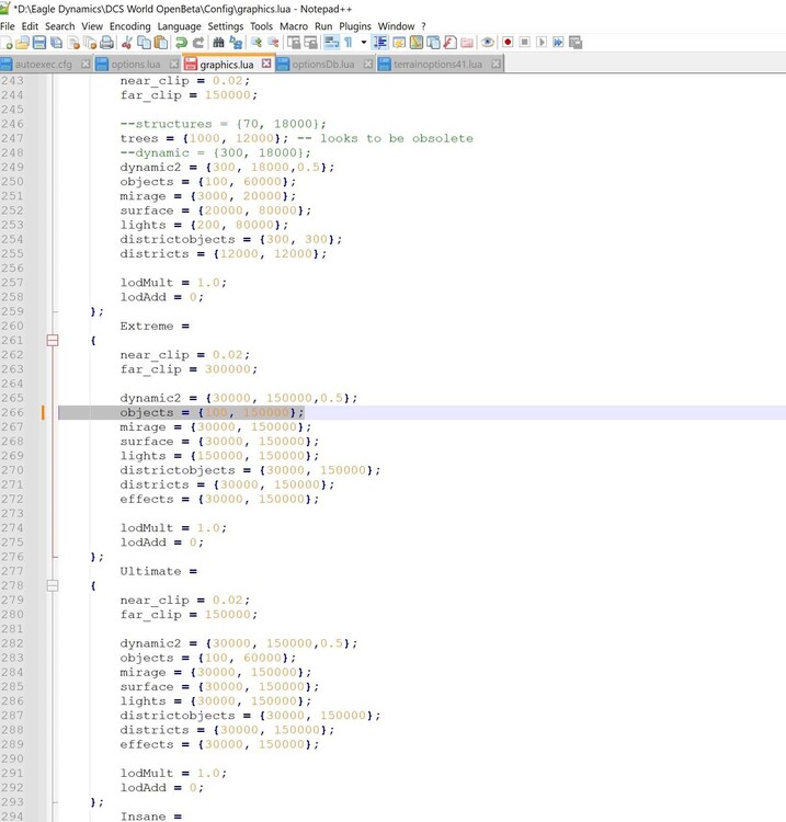 Hi all, thought I'd get something going to see if we could get new visibility options to DCS World. The process of adding these settings are known by some users in the community but as of late I feel that these settings should be fully exposed and available for all users to enjoy in the base version DCS. Making the changes are pretty straightforward once you know where to look - firstly you make an edit to the optionsDb.lua file and create new entries that will be toggleable in the options screen Next you need to make some edits to the graphics.lua this time creating new entries for the new settings and their corresponding values under distancFactor Lastly an adjustment is made to the terrainoptions41.lua by increasing the size levels of the Instancer buffers, this is required to elimate any popping-in/out of scenery objects/forests etc (I just brute force the values by adding an extra 0 to each amount) Once the sim is fired up the new options are new available. Beware of making any edits to the terrainoptions41.lua, doing so with trigger Integrity Check fail on connecting to most online servers.