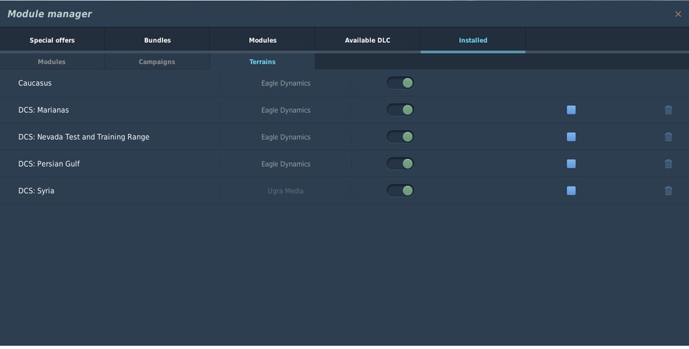 They don't appear in that window nor do they appear in the list of available DLC to download when you first open the module manager. I deleted them through module manager then deleted the files in windows. First image shows homescreen with 8 items flagged as available for DL. Second image shows that only the aircraft can be DL'd. Third image shows what terrain is currently installed. null