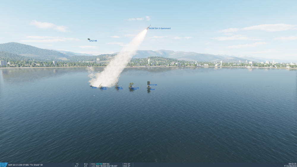 Procedure to reproduce Run the attached mission files. They contain only AI units. The mission file "demonstrator 1" is a simple demonstration of the basic bug. I think it is close to the minimal mission contents needed for this bug to work. The mission file "demonstrator 2" is a more elaborate demonstration showing a full SA-5 missile system engaging in combat while mounted on a group of moving boats. Suspected principles Static land units and non-amphibious vehicles (hereafter "pure land units") must be placed on land. Earlier testing showed that, if an amphibious vehicle is placed on a ship, that vehicle travels with the ship. Placing something on a ship, for our purposes, means that the reference position of a land unit (the centre; the point within the model of the land unit corresponding to the centre of its icon in the mission editor) overlaps with the ship's model. This result led me to suspect that, if a way could be found to place a pure land unit on a ship, that pure land unit would travel with the ship as well. This suspicion was confirmed. In the mission editor, ships and boats can only be placed on the sea. They are only capable of motion if they are not aground. Vessels with shallow draft, such as the speedboat, are capable of motion even when placed extremely close to shore because they need little depth to float and move. In certain locations in the ports depicted in the Caucasus map, the boundary between land and navigable sea is extremely sharp and steep. This causes there to exist a narrow region at that boundary where pure land units can be placed but which can also be occupied by a small part of the model of a speedboat without immobilizing that speedboat. It is thus possible to fulfil the condition for making a land unit travel with the speedboat even when that land unit is not amphibious. Expected behaviour The series of tests leading to the discovery of this bug was conducted with the purpose of finding exactly such a bug. Unusually for my bug reports, there is therefore no expected behaviour differing from the actual behaviour. See the "Opinions" section for further context. Actual behaviour The image below is a representative example of the results of successful use of this bug. When this bug is applied to static land units, they become rigidly attached to the boat in all dimensions. Static land units in this condition are upright relative to the boat. When it is applied to land vehicles, the results can be highly unpredictable. Sometimes, possibly when the land vehicle does not try to move, the result resembles that for static land units except that the land vehicle is highly tilted. Other times, possibly when the land vehicle does try to move, it appears to try to move on an invisible tilted plane rigidly attached to the boat. Under unclear conditions, land vehicles in this condition can also teleport short distances (within visual range), after which they continue to move on a plane rigidly attached to the boat. Sometimes, as shown in the image above, land vehicles become raised into the air while remaining rigidly attached to the boat. This may be possible (as I suspect it was in this case) even if the vehicle does not try to move. Opinions (Unlike the rest of this post, this section expressed my views rather than factual claims. I separate these views into this section to preserve the clarity and professionalism of the bug report.) Though I acknowledge that the behaviour I report is unambiguously a bug, I feel that it may be better to think about it as something more than a problem with the game. It reveals potential in the game that is presently underused and which I suspect would not be hard to fulfil. The direct mounting of originally land-based military equipment, including SAM systems, is a practice with recent precedent[1] in real life. Inspired by this and by experimenting with existing functionality for placing static objects on ships, I began to wonder whether functioning land units could be placed on ships as well. Though it was almost immediately apparent that this could not be accomplished using the current intended behaviour of the game or the mission editor, the possibility captured my imagination. The resulting hours of experimentation produced the results presented here. Treating this behaviour as a pure bug, I expect that it would not be hard to fix: one would merely need to make it impossible for any land unit to rest on a ship. I propose, however, that no more than a little more effort would produce a result much more friendly to the creativity of a mission designer. I specifically propose to allow the placement of pure land units on the decks of at least some ships but to make land units in such a state immobile relative to the ship. By rigidly attaching these land units to their ships, most of the potential for serious misbehaviour described in this report (teleportation, motion along invisible planes) is removed. As demonstrated by the bug and by the ability to place static objects on ships, the fundamental features required for this functionality are already present. It should therefore require little implementation effort, especially compared to the tactical and storytelling possibilities it opens. [1] https://www.thedrive.com/the-war-zone/russian-black-sea-warship-now-equipped-with-ground-based-sam-system demonstrator 2.miz demonstrator 1.miz