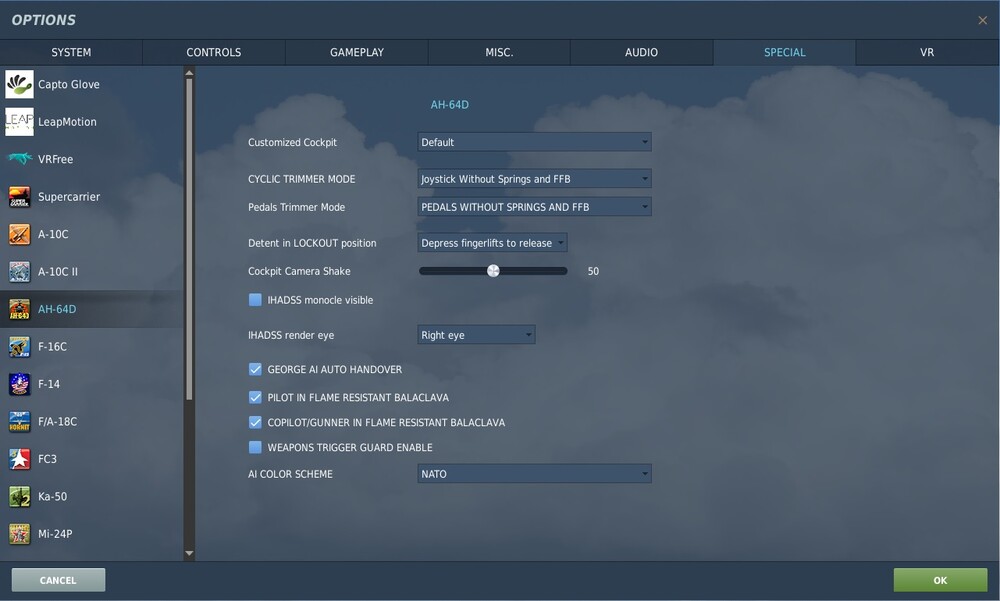 Hi I have Uh1, mi8, mi24 and apache. I am using MSFFB2 for only my helis along with TMHWH throttle and ch pro pedals (with spring) I don't have any problem with all my helis but AH64. All of them can fly almost on their own and the are very stable after trimming. But I am having difficulties with apache. It always leans left or right all the time and it is very sensitive. Am I doing something wrong with the special settings in the options menu?