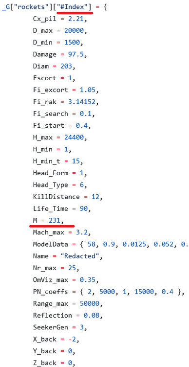 Hi, thanks. "It's likely some kind of default number that gets used if there is no mass value defined elsewhere in that variant missile's config. null" That would still be a bug. If variants F, M and P weigh 16% less than they should in cases where (for whatever reason) the proper value is not available, it's not ok. I mean, if the missile has mass of 231, it should have it at all times (before the rocket motor starts depleting some fuel), right?