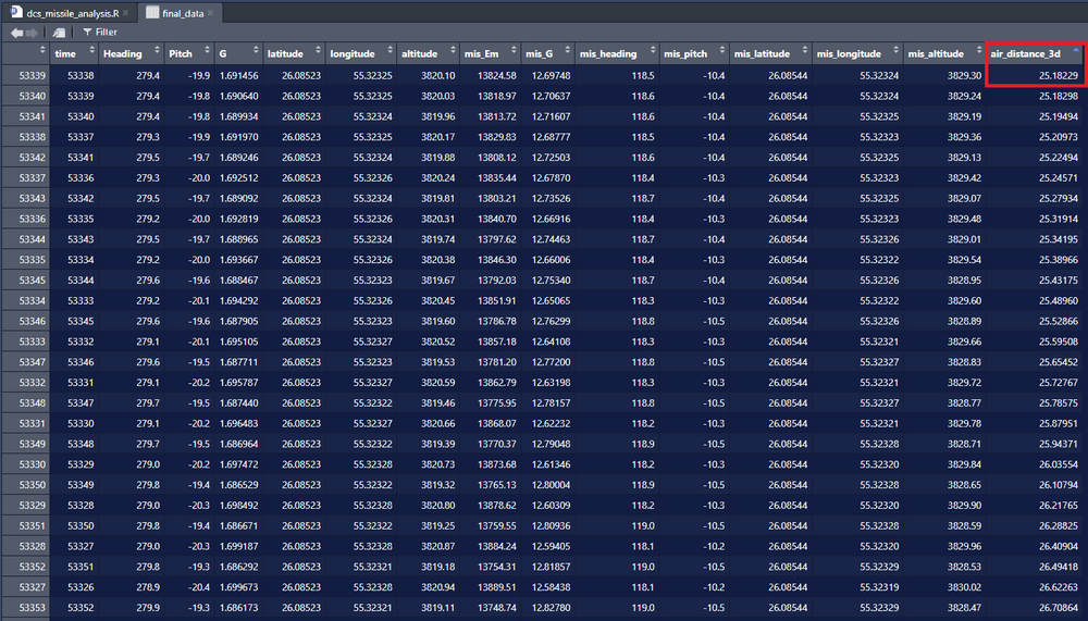 Ok pal, you've got it. AMRAAM fired at 16km, started the maneuver at 9km, AMRAAM misses by 23.6 metres while having 2.15 mach. Anything else on the menu? And btw, who's got my check? The only thing I missed was adjusting speed. If the missile has more energy, I need to compensate with speed. Other than than, I can confirm, that the AMRAAM is trying a sharp bend at the very end, but if I speed up a little, still has no chance. The resonant dance works just like previously. Always aims for my belly or to the side. One attempt before that I almost got it, 17m and wings again. At that point I knew I was on the right track with the higher speed... I mean you can literally learn those params and adjust them here and there depending on the firing aircraft's altitude, speed and range when the missile is released. If you lock him up, you'll have all these or with human GCI as well. You can see the moment of firing at close range, you can even see if the missile lofts or not. At greater range, missile loses energy sooner and it's less of an issue and you can still dodge AMRAAMs at extreme range using traditional techniques (out cold, notch, kinematic bleed). Distance confirmed in Rstudio One attempt before that, almost got it, but the wings were just enough inside the proximity fuze range. Cheers. -