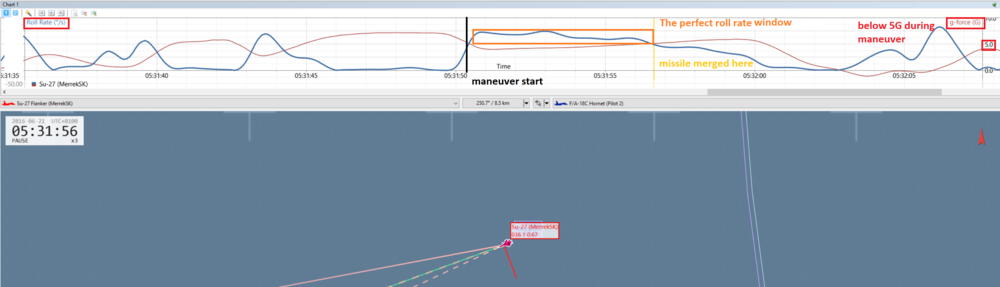 Hi guys, I've only recently discovered this thread in conjunction with all my missile research (mainly around Aim-7). I'm a huge fan of realism and simulating things as closely as they possibly could be compared to real life. I love the idea of somewhat realistic missile tracking delay, which will always be present. Radar waves travelling back and forth (fast, but not instantaneous). Electronics processing speed, software/algorithmic processing speed, Kalman filters, other calculations, etc., not to mention the inertia of the missile itself (it "wants" to continue flying straight or parabolically, displays some resistance before every maneuver). All this was discussed here before, so just a reminder. The maneuver GRY Money originally described is indeed in theory (and IRL) doable against any missile. Although in DCS, is it tied specifically to the missiles running on the new API? I don't know, you tell me. Very soon, we should have R-27 family running on this API as well. Currently, it's the Aim-7 and Aim-120. I tested the maneuver against an Aim-7 and it worked using a Flanker and an F5 (gifs attached) in singleplayer. I also tried it once in multiplayer and I'm not doing it again, until the community educate themselves, realize this is not the treacherous AoA MP roll, which leads to desync and intentional teleportation (we've all seen this and hate it) and come up with a solution, how to distinguish between the two. There are many key differences between these maneuvers, so they should be easy to identify and I will present some of them here. But I won't risk being called a "cheater" just because I literally did my own research, practiced for a few hours and made it work, while someone else is lazy to even read and calls it an AoA MP roll (performed in singleplayer with literally no AoA - see the irony here?) Let's call this maneuver a "sync roll". I find it amusing, because it is one single fluid motion, trying to get in sync with the missile tracking delay. I literally pulled raw data from TacView, exported with huge sampling rates (100-500Hz), analyzed in R, visualized in Tableau and came up with a number (fraction of a second) for the Aim-7 tracking delay. You could call it reverse engineering. Then I calculated the parameters of a perfect roll using mathematics and common sense. Only after all this I opted to practice in SP against AI and after a few tries, the first success came. Let me be clear - this is an extremely difficult maneuver to pull off, even if you know exactly, what to do. Success rate (at best) is 20-50% and it only works directly head-on. It's not about achieving some arbitrary threshold of AoA or pulling too many Gs, it's the complete opposite. I've been able to do it with as low AoA as 4 (!) and pulling less than 5Gs in one fluid motion. The key metric, however (as mentioned in this thread already) is the roll rate. Not every aircraft rolls sufficiently enough, for instance, my beloved MiG-29 can't perform this maneuver. Blue planes should have very little trouble doing it. There is no gauge for roll rate inside the aircraft, so it's only about practice, experience and feeling. You need to keep the perfect, "resonant" roll rate with sufficient precision in the correct range, or you will oversteer and run into the missile. If your roll rate is too slow, the missile will catch up. We're talking a max deviation of ~20-30 deg/s from the ideal value (which differs for every missile depending on its tracking delay, so the maneuver needs to be adjusted and practiced independently for every missile type). The smaller the tracking delay, the faster the roll rate needs to be. You see, any id*ot in multiplayer can snap or jink the joystick to disappear in ping/lag/whatever, but I dare the most experienced and best DCS pilots to try out the method described here to dodge a missile head-on in singleplayer in anything else than an F-16. Key differences between the banned/unrealistic/cheat MP AoA roll and the supposedly hyperrealistic SP sync roll: criteria MP AoA roll SP sync roll where only in MP SP and MP why breaking a threshold of unpredictability holding a very narrow roll rate window in sync with missile tracking delay who any loser who snaps a joystick requires study, training and perfect execution without a key gauge - roll rate meter what extreme AoA (20+), extreme G (8+) casual AoA (<6) and G (<5) duration possibly tens of seconds 5-7 seconds character snapping, unpredictable one single very smooth fluid motion result desync, teleport missile tracks, but misses as separation > proximity fuze range missile aspect from any side exclusively head-on, including pitch adjustment to fly directly toward success rate 100% 20-50% at best if practiced and executed to perfection type proper cheat speculative last-resort maneuver if there's no time to even notch The reason, why the missile misses you, could be best described as follows: 1 - the missile is trying to lead your nose (velocity vector to be hardcore) 2 - you start performing the maneuver at the proper distance from the missile (again, this needs to be judged and practiced, observing contrails, etc.) 3 - missile starts maneuvering with you, after the tracking delay 4 - you're keeping the "resonant" roll rate and tight barrel roll with realistic AoA and Gs 5 - the missile starts trailing you, aims below your belly 6 - if you've kept the roll rate in the ideal window, you create and offset in the missile tracking of about 90-180 degs on the barrel roll circle (180 would correspond to the missile aiming directly below your belly, 90 degs is to the side) 7 - if you can keep this to the "merge", you've successfully created a distance offset between yourself and the missile 8 - if this distance offset is bigger than the missile's proximity fuze range, the missile misses you and doesn't explode I've had cases when I did manage to create an offset, but it wasn't enough and the missile exploded damaging the aircraft (although 