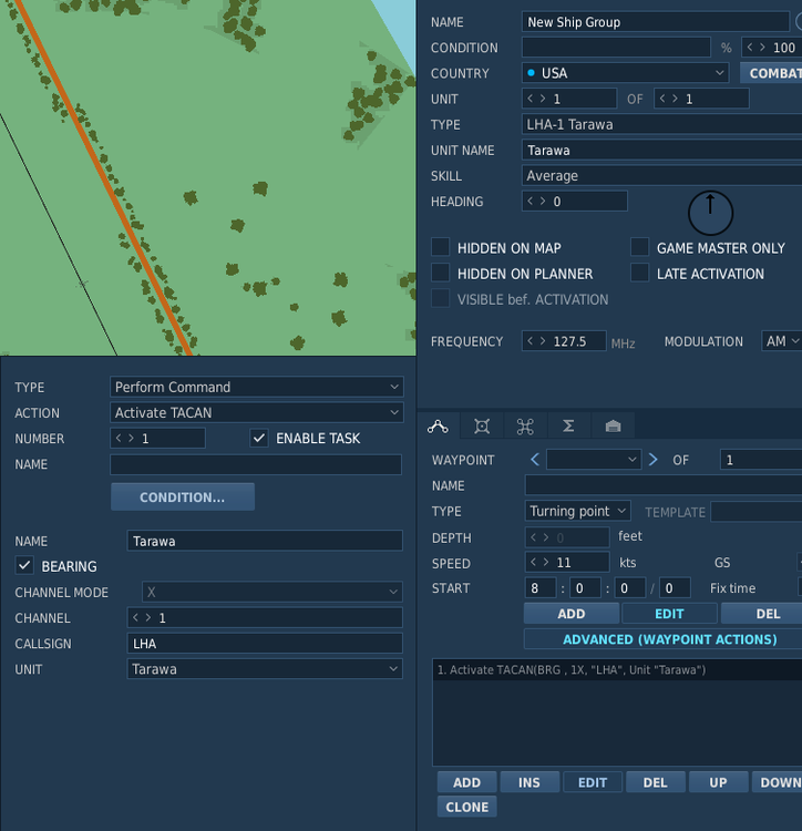 I've made a few missions where I've had a ADF beacon transmitting from a trigger zone. You can do this by setting a radio transmission trigger on the desired frequency and the game reads it as properly transmitting station and you can home in on that. Note that you (apparently) need a .ogg file, even a completely silent .ogg looping lets you home in. It works for static stuff if you want to create your own stations but things get more complicated if you want your beacon to move. Other way is through the advanced waypoints. Under "perform command" you have a similar menu but you have to set another command for the frequency. This is side locked so a blue unit transmitting on 600kHz is only transmitting to the blue coalition and the ships waypoint options, for reasons unknown) are limited so you can't use this on ships but you can for example set a car driving around and transmitting as a moving homing station if you wish. Then there's always scripting which allows for way more and then some but is that much more difficult. Tarawa let's you set up the TACAN through the advanced waypoints as well. You set it up on the WP you want it to start transmitting. Kuznetsov doesn't have this. Then again, KA-50 doesn't have TACAN so you're out of luck there :) edit: whoops, misread your message Accipiter and actually answered nothing there assuming your ship is moving. Sorry about that. You could try and make an AI helicopter stay on the ship and transmit but it's a silly workaround that I haven't tested. edit2: you could also try and make a triggerzone moving, there's at least (UNIT INSIDE MOVING ZONE) which ties the created zone to a unit. I'm not sure if this breaks the transmission though.