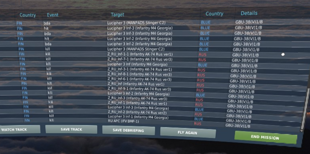Hello. 90% is max. 3rd modules off, no VoiceAttack. Played many times. 8 maybe 10 times. mission flow: SUCCESFULL HIT: FIRST APC with AGM 65 > confirmed by LOKI 24 SUCCESFULL HIT: SHILKA on coordinates with GBU12 > confirmed by LOKI 24 SUCCESFULL HIT: TANK on coordinates with GBU12 > confirmed by LOKI 24 ("splash one tank") SUCCESFULL HIT: TRUCKS on summer house with CBU > confirmed by NJORD 21. ("trucks is damaged or destroyed") SUCCESFULL HIT: HOUSE with 20mm > confirmed by NJORD 21. ("good hit good hit"). After this, mission SCORE 50, RESULT 50, after landing is RESULT 90. AT SCORING has bad information. NO GUNDISH/shilka info, but second tank. in game im not navigated to destroy second tank. few players reported before. What do you need for fix it finnaly?