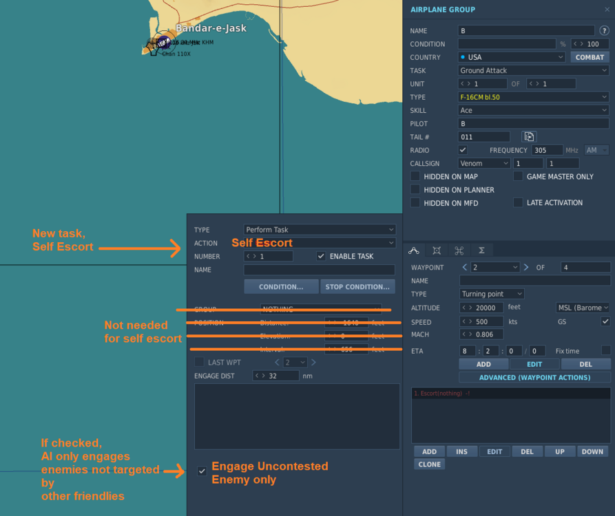 In DCS there is no way to control how multirole aircraft defend themselves. They tend to wait too long and get attacked before reacting, usually jettisoning payloads and being forced into inadvantageous positions as a result. If we could assign self escort tasks, they would provide some degree of control over AI self defense. I envision two primary tasks, but there might be a need for more: 1 - Self Escort - This is basically a copy of the existing Escort task except the group that is assigned the task will escort itself instead of another group. The purpose of this is to set a radius around the group within which they will automatically attack threats of the type specified in the task (fighter, interceptor, etc). An addition to this feature over the original Escort would be an option to only engage uncontested enemies. In other words if checked, the self escort only triggers on enemies that are not being engaged by other units on the same side/coalition as the self escorting plane. If checked, the AI does not engage fighters that are being attacked by other friendly fighters. Example image: xxxx xxxx 2 - Search Then Engage [ also In Zone] - Similar to the existing Search Then Engage tasks, but also has the checkbox for engaging uncontested enemies. I would like to suggest implementing this previously requested change to Search Then Engage of all forms: Summary - Give us control over what part of the route Search Then Engage covers to prevent the AI from chasing things 200 miles away. These tasks should also be available for ALL Task categories. Otherwise this existing problem may persist: