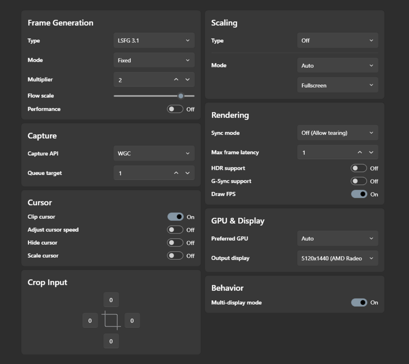 This works very well for many games for me. But I cannot make it work with my main monitor (5210x1440) and two additional MFD displays (800x600). The two MFDs desktops are virtually arranged top right and bottom right of my main. When I run Lossless scaling the MFD pictures are shown half on the main monitor and half on the respective small displays. I tried to fiddle around with the crop setting, but couldn't manage. Any idea to make lossless scaling run with the three monitors? Settings: Scaling mode: auto / Fullscreen Scaling type: off Frame Gen: LSFG 2.1 x2 Capture: DXGI Output display: 5120x1440 Multi-display mode: on (played around with these settings, no joy)