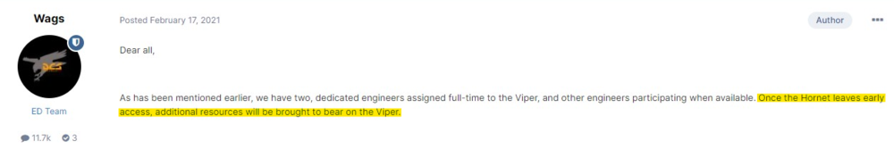 Hey, @BIGNEWY I appreciate the action. It is always good to have confirmation in either way, as much as we hate to hear some news, even though I understand they might be needed for business continuity. However, even when those weren't the exact words or phrasing, I clearly remember that was the spirit, and I think mostly everybody would agree to that. Not trying to be nitpicky, but if we were to go by what was exactly said, we could also argue that: Which clearly is not the case, as the Hornet has not yet left EA. That being said, I understand it would do nobody good to leave the developers in the Hornet, and leave other modules unattended. I could even accept (I know many people wouldn't) Hornet already leaving EA, as it is, when there was a firm promise of a roadmap being completed later on (with a given list of features). I, anyway, have other modules to employ my time into, and enjoy them... but we should also think in people that purchased the Hornet based on some assumptions, when there was no viper, no Apache... and now are left aside... No hard feelings, and I'm not trying to pick on you. As I said, I appreciate the effort, and if you come back after checking with Wags to share some bit of "official" info, it will be more than welcome
