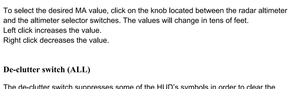 Hello, In the Mirage F1 EE, when using the rho button to increase range for the VAD mode on TACAN, distances are in full Nm. If I'm not mistaken, it should be in Nm and the last digit in 0.1 Nm. The range for VAD should be from 0. 1 to 999,9 Nm, and not from 1 to 9999 Nm as it is now. I'm not 100% sure, but the Mirage 2000 which uses the same VAD mode is definitely working this way. It sounds more logical, since you often need a precision to 0.1 Nm and 1° when flying (e.g. TACAN approach). Thanks