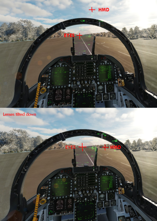 Im struggling with the HMD in VR, its way too high up. If I go through the alignment procedure, on the ground (cold start) or in the air (hot start) it still ends up way too high so I end up looking out the cockpit with my chin on my chest to move the hmd centre to pick a target. Can it be shifted downwards?null Screenshot shows me looking straight ahead before and after alignment