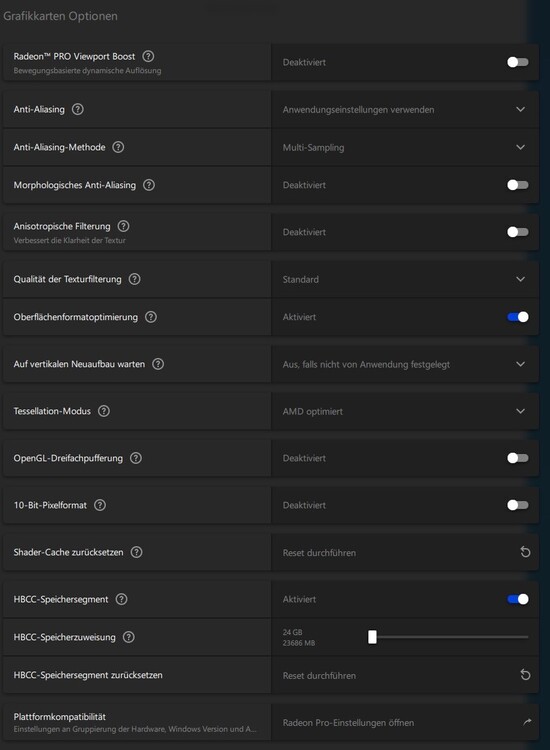 Did this also - no change Did this also - again no change I assume you speak german, so I attached the settings of the new AMD control panel which has the german translations (but should be understandable for english speakers, too). I am a "normal user" and have NO IDEA what most of this stuff means. So these are all the default settings. Any suggestion, if some of these are interfering with the in-game settings? If someone has a suggestion for changing a setting I will try this, too... -