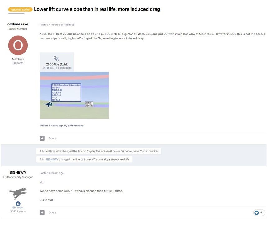 Is the F-16C the worst dogfighter of its era in DCS right now?oldtimesake replied to Youda's topic in Chit-Chat Now the DCS F-16 required twice the amount of AOA to reach the same G compared to real F-16 block50, resulting in more induced drag (could be a factor of 4). Confirmed by ED The DCS F-16 also suffers from lower acceleration than the real one. Either the thrust or the drag or both are broken:
