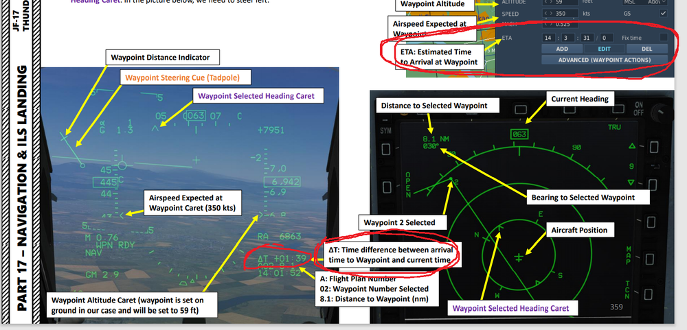 Well, yes, Chucks is like the most comlete manual out there, the offcicial one is like msssing a lot of information. Back t the issue: it doesnt sound logical and what you describe is not what we see in the module: If I set the waypoint in the ME, then the arrival time is calculated... but that calculation is not static: if you accelerato and move faster, the arrival time is modified in the HUD. If you go slower the delta time is calculated again. So: the time is calulated onlive, is not just a number we get at the start of the mssion. The onboard computer is the one doint this calulation based on a GPS posicion + speed. So the assumption that the arrival time is set only by the ME editor is not correct. We can leave this issue like it is now, but every other player that has seen my JF module has pointed this like a bug. We smust take as correct that a 4th generation figther can not compute the arrival time to a GPS location and that we must do the calculation by hand? something is wrng here... -