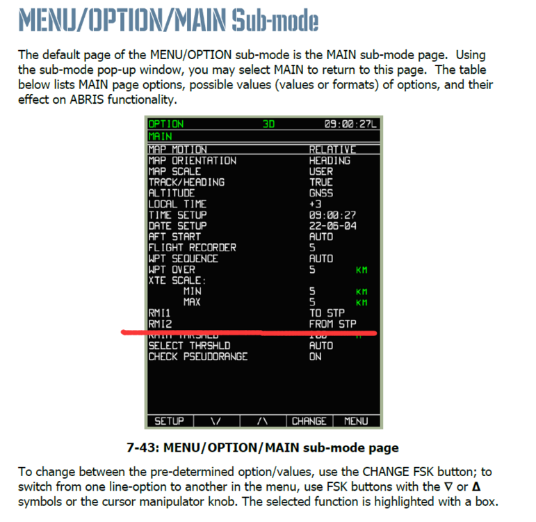 Hi...another small bug,minor detail. ABRIS RMI2 pointer (Red pointer on ACR and HSI page)can show "TO STP" "FROM STP" and "RADIO" information depending on setting. It's default to "RADIO" which shows information from AKR-22 ADF When no ADF signal is received,it will not showing up of course. It works fine if u change the setting with ADF signal being received. Also if u are already in "TO STP' or "FROM STP" mode,and then the ADF signal is gone,the RIM2 pointer will continue working fine. But if u change it's setting from "RADIO" to "TO STP' or "FROM STP" when no ADF signal is received,the RIM2 pointer will not show up,until u have ADF signal being received and got the setting cycled back through "RADIO". RIM2 not showing up.trk Just a minor detail,hope for a fix when free,thanks.