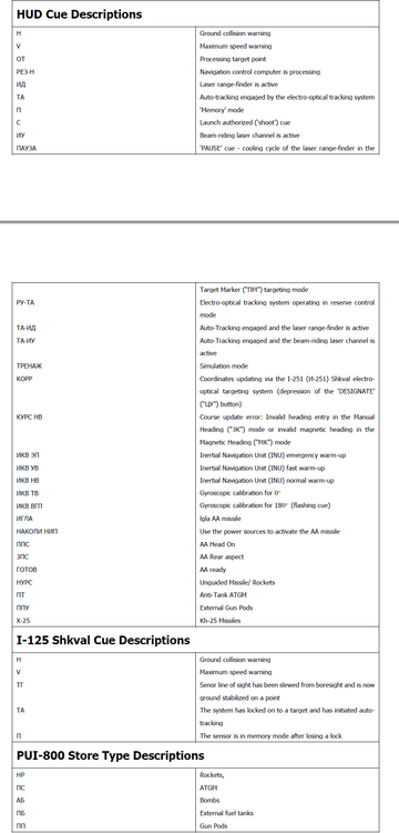 No u don't need that switch below HSI in STDBY to fire 9A4172 AT9 Vikhr missile, keep it in the right MANUAL positIon. The Left STDBY positon will set leaser to high energy target designation mode,(for laser guided weapons similar to GBUs,Hellfires,and will potentially burn the laser faster ),and for Ka50 the Only weapon uses this mode is KH25 missile(the big white missile). 9A4172 AT9 Vikhr missile is a Laser Beam Riding missile,completely different from GBUs or laser Hellfires, so u keep it in right Manual position for Vikhr. The label for this switch is really confusing,just remember,left guard open= Kh25,right guard close= everything else. Setting avionic language in the gameplay to english as for now only changes ABRIS and EKRAN language. English HUD is not ready yet for BS3,hopefully we will have it soon...(also there is a English HUD mod on the fourm,not sure if it works for the current version though.) Here is a short list for things could be displayed on the HUD and their meanings...