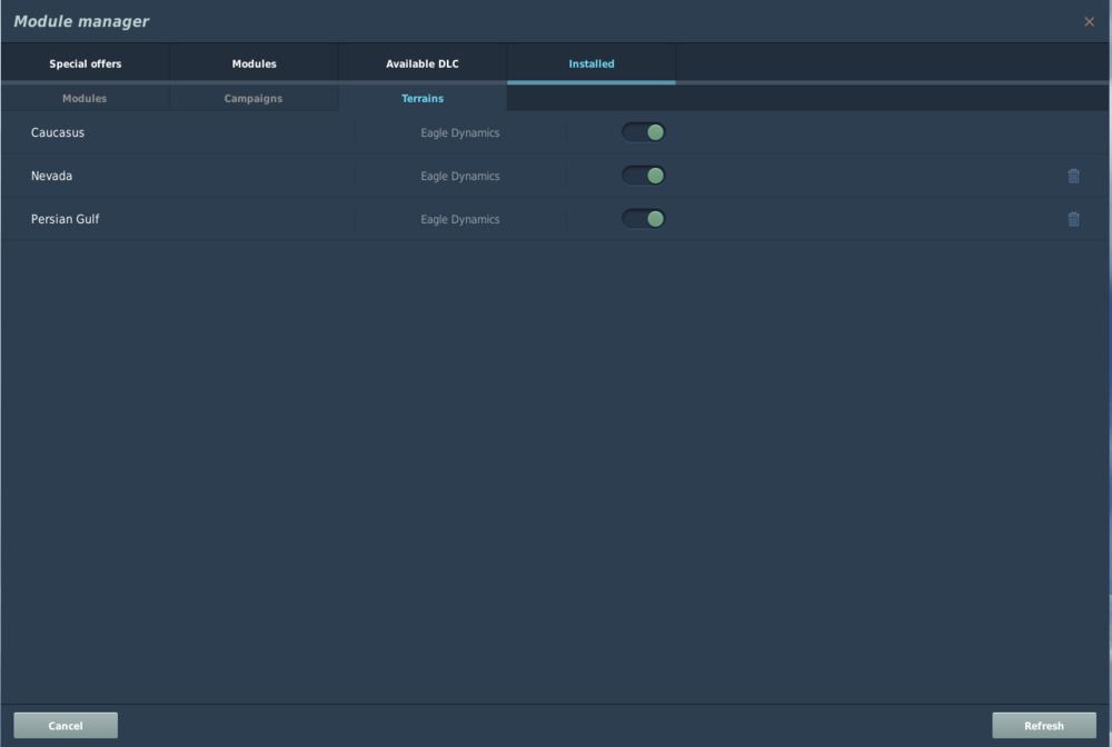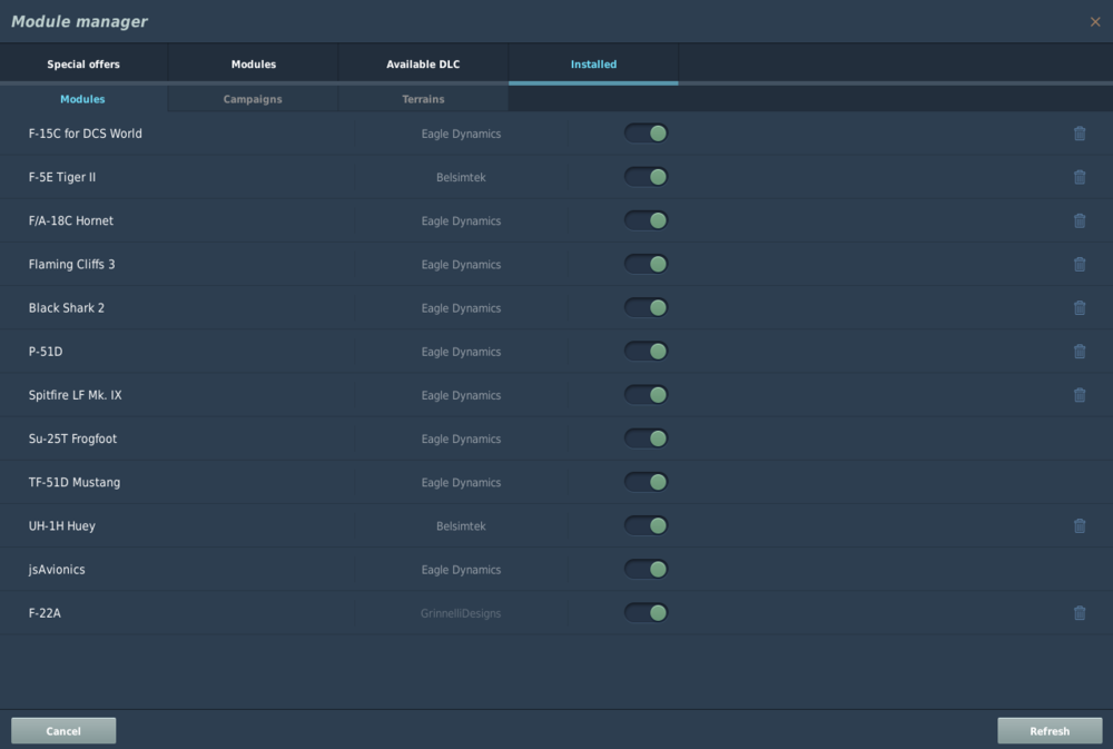 Thank you in advance, i'm not sure why i couldn't add the .log as an attachment, so I'm going to paste it. if there's a better way, please let me know. I did a DCS Repair last night before going to bed, and it reverted back to the Release, but it didn't fix my module problem. only difference is that now Normandy map doesn't appear in Module Manager anymore. Below the log are screenshots showing that the module Manager says I have so problems are No F5 to fly, or the 2 Helicopters it says I have. and I don't have my Nevada map (purchased) or Normandy (Trial) Thank you again ------------------------- === Log opened UTC 2020-04-29 15:39:38 2020-04-29 15:39:38.495 INFO DCS: Command line: "C:\Program Files\Eagle Dynamics\DCS World\bin/DCS.exe" 2020-04-29 15:39:38.495 INFO DCS: DCS/2.5.5.41371 (x86_64; Windows NT 10.0.18363) 2020-04-29 15:39:38.519 INFO DCS: Hwid: 3ZK8-7pcLndtoIZD3OvKXD-0PvFm30v1s7NEKQ 2020-04-29 15:39:38.519 INFO DCS: DCS revision: 161370 2020-04-29 15:39:38.519 INFO DCS: Renderer revision: 19709 2020-04-29 15:39:38.519 INFO DCS: Terrain revision: 19859 2020-04-29 15:39:38.519 INFO DCS: CPU cores: 8, threads: 16, System RAM: 16320 MB, Pagefile: 20376 MB 2020-04-29 15:39:38.549 INFO EDCORE: (dDispatcher)enterToState_:0 2020-04-29 15:39:38.563 INFO Dispatcher: 2020/4/29 11:39 V1803061700 2020-04-29 15:39:38.582 INFO INPUT: Device [Keyboard] created deviceId = -1 2020-04-29 15:39:38.596 INFO INPUT: Device [Logitech Extreme 3D {F2D635C0-26F1-11ea-8001-444553540000}] created deviceId = -1 2020-04-29 15:39:38.596 INFO INPUT: Joystick created[Logitech Extreme 3D {F2D635C0-26F1-11ea-8001-444553540000}], ForceFeedBack: no 2020-04-29 15:39:38.632 INFO INPUT: Device [Mouse] created deviceId = -1 2020-04-29 15:39:38.634 INFO INPUT: Device [TrackIR] created deviceId = -1 2020-04-29 15:39:38.654 INFO SOUND: Using driver: xaudio29 2020-04-29 15:39:38.671 INFO SOUND: Found 4 available audio device(s): 2020-04-29 15:39:38.671 INFO SOUND: 0: ID: "\\?\SWD#MMDEVAPI#{0.0.0.00000000}.{e5d6be83-7fd6-4b84-8515-ab0238aecc24}#{e6327cad-dcec-4949-ae8a-991e976a79d2}", Name: "Speakers (Razer Kraken X USB)" 2020-04-29 15:39:38.671 INFO SOUND: 1: ID: "\\?\SWD#MMDEVAPI#{0.0.0.00000000}.{85eaa9b9-26d1-4445-9fe7-780281884db1}#{e6327cad-dcec-4949-ae8a-991e976a79d2}", Name: "Realtek Digital Output (Realtek® Audio)" 2020-04-29 15:39:38.671 INFO SOUND: 2: ID: "\\?\SWD#MMDEVAPI#{0.0.0.00000000}.{4779440a-7b30-42a4-93e1-d74cb604b8bf}#{e6327cad-dcec-4949-ae8a-991e976a79d2}", Name: "Speakers (7.1 Surround Sound)" 2020-04-29 15:39:38.671 INFO SOUND: 3: ID: "\\?\SWD#MMDEVAPI#{0.0.0.00000000}.{f29629a7-56db-4e4c-9cb9-fe0a84a56fc2}#{e6327cad-dcec-4949-ae8a-991e976a79d2}", Name: "C27F591 (NVIDIA High Definition Audio)" 2020-04-29 15:39:39.163 INFO SOUND: loaded 1578 sdefs from "sounds\sdef" 2020-04-29 15:39:39.163 INFO SOUNDER: Preloading Sounders from Sounds\Sounders 2020-04-29 15:39:39.253 INFO Dispatcher: InitLow 2020-04-29 15:39:46.694 INFO NET: Login success. 2020-04-29 15:39:47.429 INFO NET: Got auth data. 2020-04-29 15:39:47.835 INFO DCS: Successfully got authorization data. 2020-04-29 15:39:47.839 INFO Dispatcher: Loading installed modules... 2020-04-29 15:39:48.068 ALERT SECURITYCONTROL: Manifest 'mods/aircraft/f-5e/dcs_manifest.x86_64' is from a different build. 2020-04-29 15:39:48.120 ERROR SECURITYCONTROL: Failed to parse manifest: mods/aircraft/spitfirelfmkix/dcs_manifest.x86_64 2020-04-29 15:39:48.702 ERROR SECURITYCONTROL: Failed to parse manifest: mods/terrains/nevada/dcs_manifest.x86_64 2020-04-29 15:39:49.424 INFO Scripting: OBSOLETE mount_vfs_sound_path() used in ./CoreMods/aircraft/AJS37/entry.lua 2020-04-29 15:39:49.547 ALERT Scripting: loadfile: can't open './Mods/aircraft/SpitfireLFMkIX/views.lua' 2020-04-29 15:39:49.848 INFO Scripting: OBSOLETE mount_vfs_sound_path() used in C:\Users\pat54\Saved Games\DCS\Mods/aircraft/f-22a/entry.lua 2020-04-29 15:39:49.857 INFO Scripting: PLUGINS START------------------------------------------------- 2020-04-29 15:39:49.895 INFO SOUNDER: Preloading Sounders from .\CoreMods\tech\TechWeaponPack\Sounds\Sounders 2020-04-29 15:39:49.933 INFO SOUNDER: Preloading Sounders from .\CoreMods\tech\USS John C Stennis\Sounds\Sounders 2020-04-29 15:39:49.949 INFO SOUND: loaded 26 sdefs from ".\coremods\aircraft\ajs37\sounds\sdef" 2020-04-29 15:39:49.981 INFO SOUND: loaded 15 sdefs from ".\coremods\aircraft\av8bna\sounds\sdef" 2020-04-29 15:39:49.981 INFO SOUNDER: Preloading Sounders from .\CoreMods\aircraft\AV8BNA\Sounds\Sounders 2020-04-29 15:39:49.989 WARNING EDCORE: Source ./CoreMods/aircraft/AV8BNA/Shapes is already mounted to the same mount /models/. 2020-04-29 15:39:50.028 INFO SOUND: loaded 11 sdefs from ".\coremods\aircraft\c-101\sounds\sdef" 2020-04-29 15:39:50.055 WARNING EDCORE: Source ./CoreMods/aircraft/C-101/Liveries is already mounted to the same mount /textures//liveries/. 2020-04-29 15:39:50.067 INFO SOUND: loaded 28 sdefs from ".\coremods\aircraft\chinaassetpack\sounds\sdef" 2020-04-29 15:39:50.067 INFO SOUNDER: Preloading Sounders from .\CoreMods\aircraft\ChinaAssetPack\Sounds\Sounders 2020-04-29 15:39:50.168 INFO SOUND: loaded 5 sdefs from ".\coremods\aircraft\christen eagle ii\sounds\sdef" 2020-04-29 15:39:50.193 ERROR EDCORE: Can't mount coremods/aircraft/christen eagle ii/textures2. Drivers errors: 2020-04-29 15:39:50.193 ERROR EDCORE: EDCDriver: there is no directory coremods/aircraft/christen eagle ii/textures2.edc 2020-04-29 15:39:50.193 ERROR EDCORE: FSDriver: there is no directory coremods/aircraft/christen eagle ii/textures2 2020-04-29 15:39:50.193 ERROR EDCORE: ZipDriver: Can't open zip archive coremods/aircraft/christen eagle ii/textures2.zip. 2020-04-29 15:39:50.290 INFO SOUND: loaded 26 sdefs from ".\coremods\aircraft\f14\sounds\sdef" 2020-04-29 15:39:50.290 INFO SOUNDER: Preloading Sounders from .\CoreMods\aircraft\F14\Sounds\Sounders 2020-04-29 15:39:50.309 ERROR EDCORE: Can't mount coremods/aircraft/f14/textures/lns_f14_exterior. Drivers err